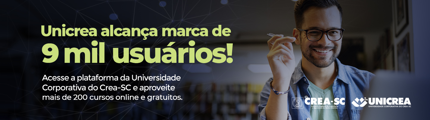 Unicrea – Universidade Corporativa do CREA-SC. Mais de 150 cursos online e gratuitos e diversas parcerias com instituições de ensino e empresas, visando o aperfeiçoamento contínuo dos profissionais registrados, dirigentes e membros do Creajr-SC e público interno do CREA-SC