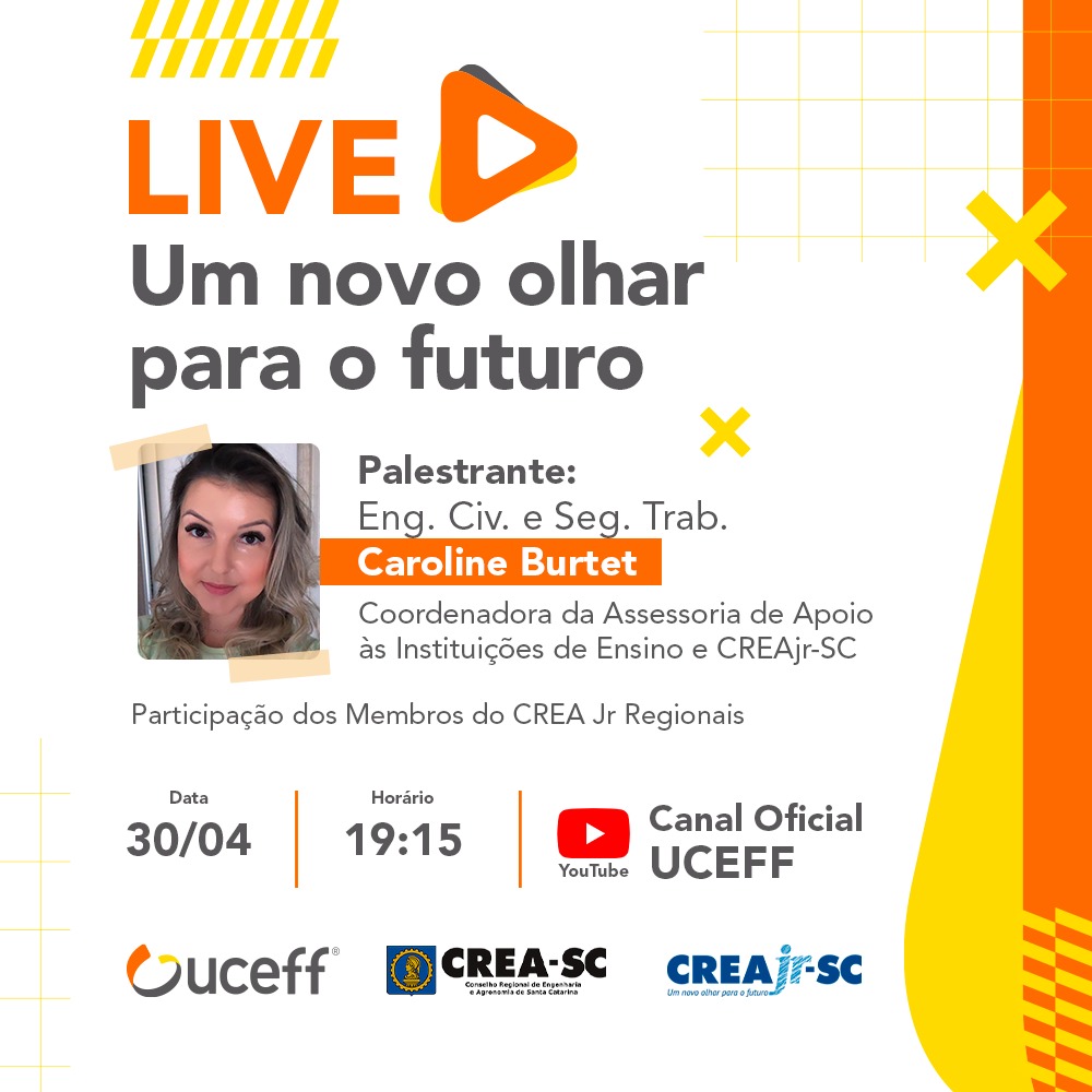 Um novo olhar para o futuro é o tema da live promovida pelo CREA-SC em parceria com o Creajr-SC, nesta sexta-feira, 30/04, a partir das 19h15, para acadêmicos da UCEFF – Unidade Central De Educação Faem Faculdade. A palestraste será a Eng. Civil e Seg. Trab. Caroline Burtet, assessora de apoio às instituições de ensino e Creajr-SC, falando sobre a legislação, registro e atribuições profissionais e o papel do Conselho na fiscalização do exercício profissional na área da engenharia, agronomia e geociências.