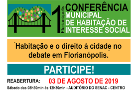 Está disponível no site da Conferência a consulta pública http://www.pmf.sc.gov.br/sistemas/conferenciaHabitacao/inscricaoConsulta.php, que tem por objetivo antecipar e sistematizar demandas e propostas das comunidades para o embasamento da primeira revisão do Plano Municipal de Habitação de Interesse Social, através das plenárias regionais.
