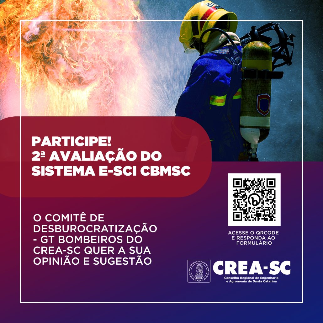 No intuito de continuarmos contribuindo com a melhoria dos serviços de engenharia, o CREA-SC, por meio do Comitê de Desburocratização – Grupo de Trabalho Bombeiros, vem promover a 2ª avaliação do Sistema E-SCI do Corpo de Bombeiros Militar de Santa Catarina – CBMSC.