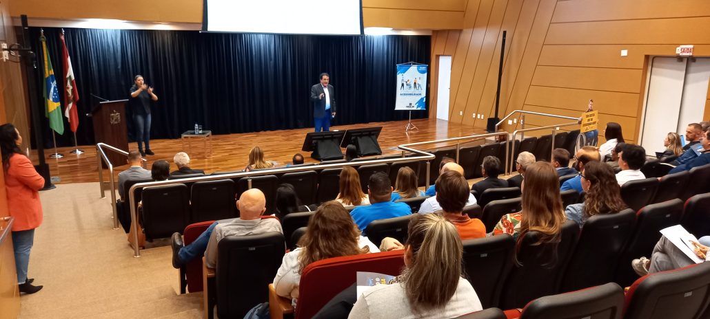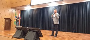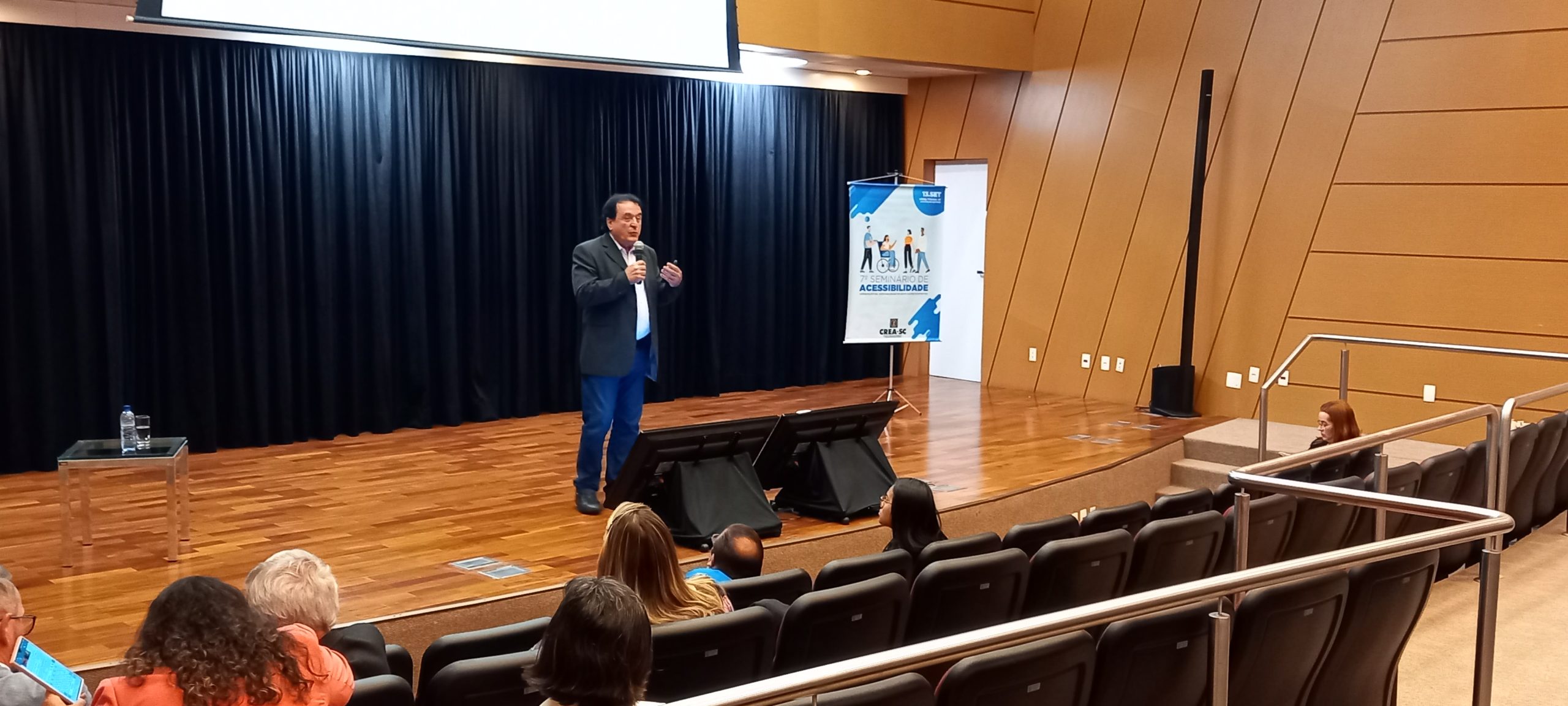 A palestra de abertura foi ministrada pelo conselheiro e coordenador da Comissão de Acessibilidade do CREA-SC, Eng. Civil Rogério Novaes com o tema “Acessibilidade: Semente da Inclusão – Conceitos e Valores”.