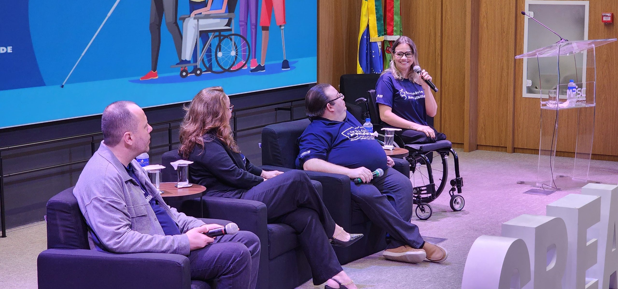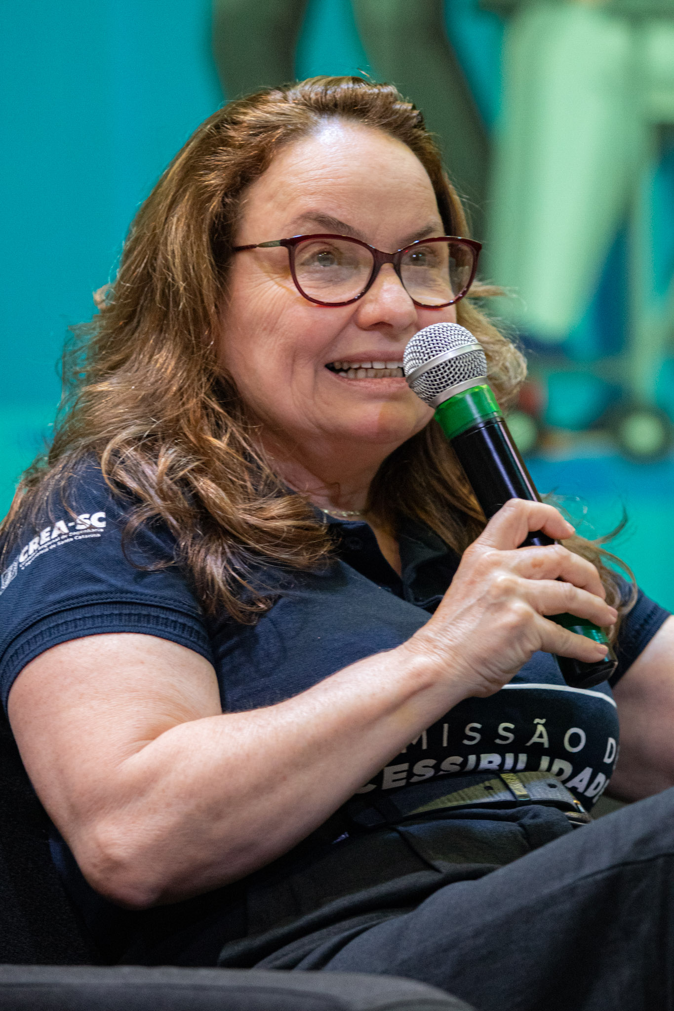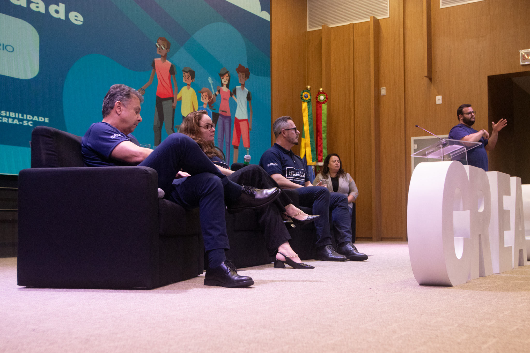 Em outra mesa redonda foi discutido as experiências e desafios enfrentados no cotidiano das PCDs, com participação de Francielle Santos, colaboradora da FIESC e integrante do projeto Surf Sem Fronteiras, Guilherme Strack, colaborador do CREA-SC e Paulo Suldowski, presidente do Conede SC, mediados pela Eng. Silvânia do Amaral.