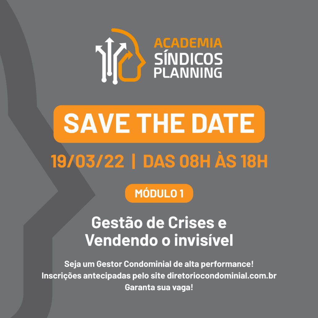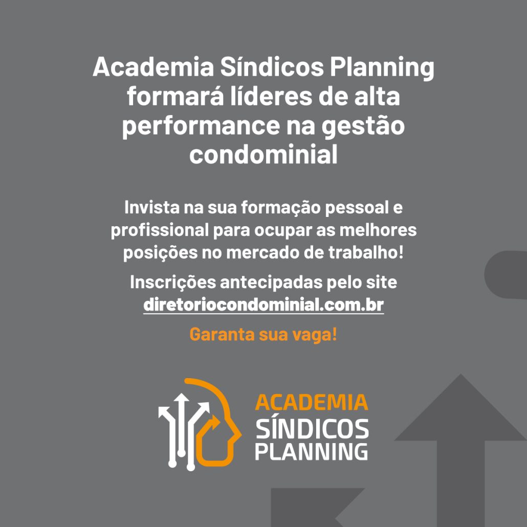 A Academia Síndicos Planning formará líderes de alta performance na gestão condominial e irá fomentar ações de capacitação, sempre inovando e oferecendo o mais alto nível de ferramental para tornar os Síndicos e Administradoras de Condomínios mais qualificados, reconhecidos e valorizados. O evento inicia dia 19.03 e tem o apoio institucional do CREA-SC, entre outros órgãos e entidades. As inscrições estão abertas e são obrigatórias para garantir uma das vagas limitadas: https://diretoriocondominial.com.br/