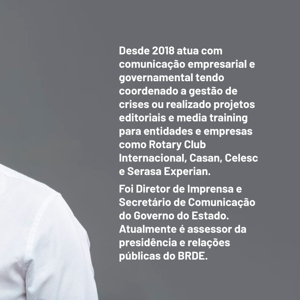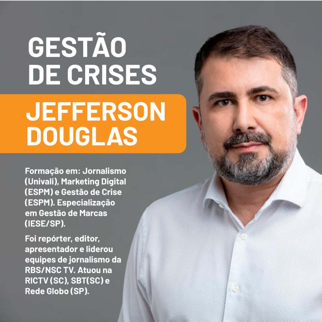 Jefferson Douglas da Silva é especialista em Gestão de Marcas e de Crise, já atuou como diretor de Imprensa e secretário de Comunicação do governo de Santa Catarina e, atualmente, é assessor da diretoria do BRDE, a atividade fará com que os gestores coloquem a mão na massa. Com ampla experiência na gestão de crises, ele já esteve na cobertura jornalística e no desenvolvimento de iniciativas para enfrentar situações como o acidente com o avião da Chapecoense, o afastamento do govenador do Estado, enchente em Blumenau, a onda de ataques de facções criminosas em Florianópolis e, mais recentemente, auxiliou na estruturação da comunicação na pandemia de coronavírus.