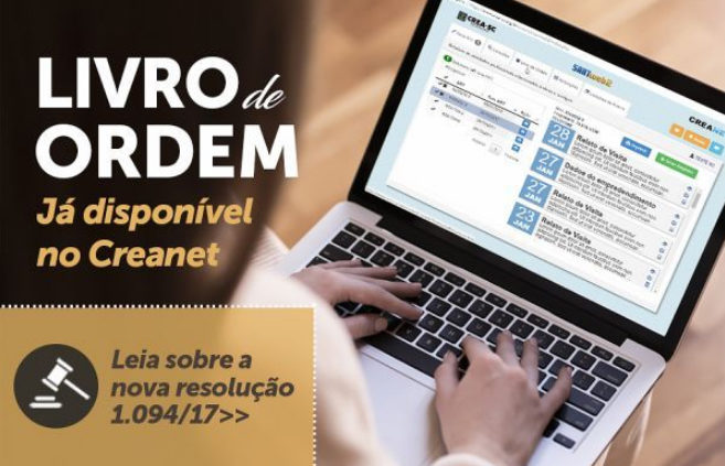 O CREA-SC disponibiliza a partir desta quarta-feira, 10.01 no Creanet profissional a aba para o registro do “Livro de Ordem” de Obras e Serviços das profissões abrangidas no sistema Confea/Crea, de acordo com a resolução 1.094/17 do Confea, publicada no DOU em 06.11.17.