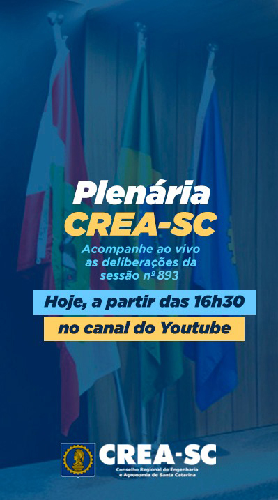 Acompanhe ao vivo a Sessão Plenária do Crea-SC nº 893, com início às 16h30 desta sexta-feira, 5 de fevereiro, realizada por videoconferência e transmitida pelo canal do YouTube.