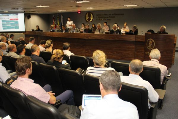 A reunião é presidida pelo presidente do Conselho Eng. Civil e Seg. Trab. Carlos Alberto Kita Xavier e conta com a participação do presidente da CREADCREA Cooperativa de Crédito Eng. Civil Gelásio Gomes e do diretor financeiro da Mútua-SC, Eng. Civil Laércio Domingos Tabalipa.