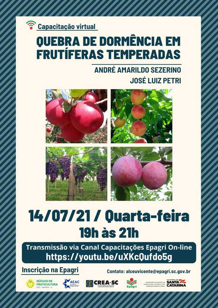 A Associação dos Engenheiros Agronômos da região de Caçador (AEAC) realiza na próxima quarta-feria, 14, das 19h às 21h, uma palestra sobre “Quebra de dormência em frutíferas temperadas”, minsitrada pelos engenheiros agrônomos André Amarildo Sezerino e José Luiz Petri.