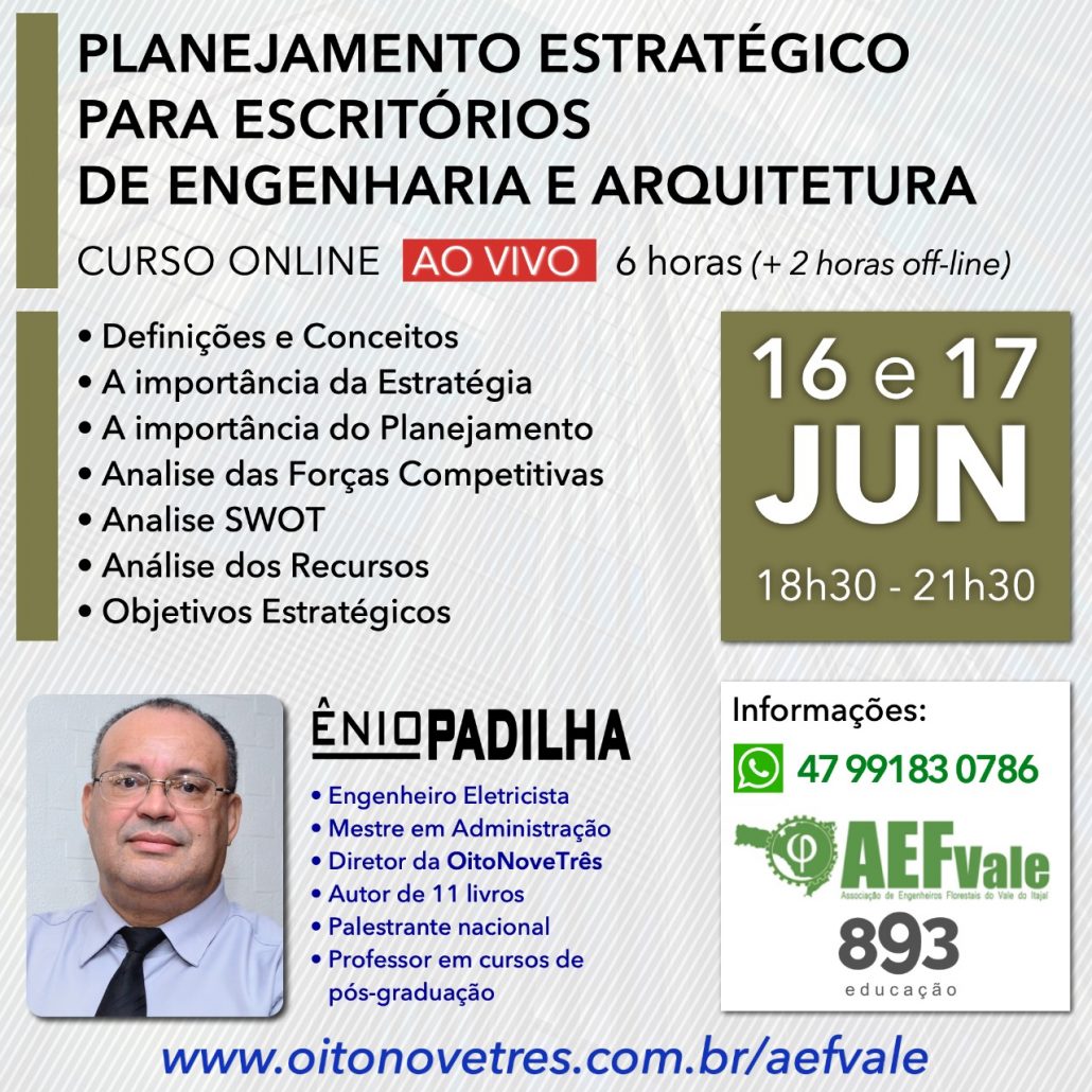 A AEFVale e a Oitonovetrês Produções oferecem o curso de capacitação profissional “Planejamento Estratégico para Escritórios de Engenharia”, com o renomado Engenheiro Ênio Padilha, totalmente online e ao vivo.