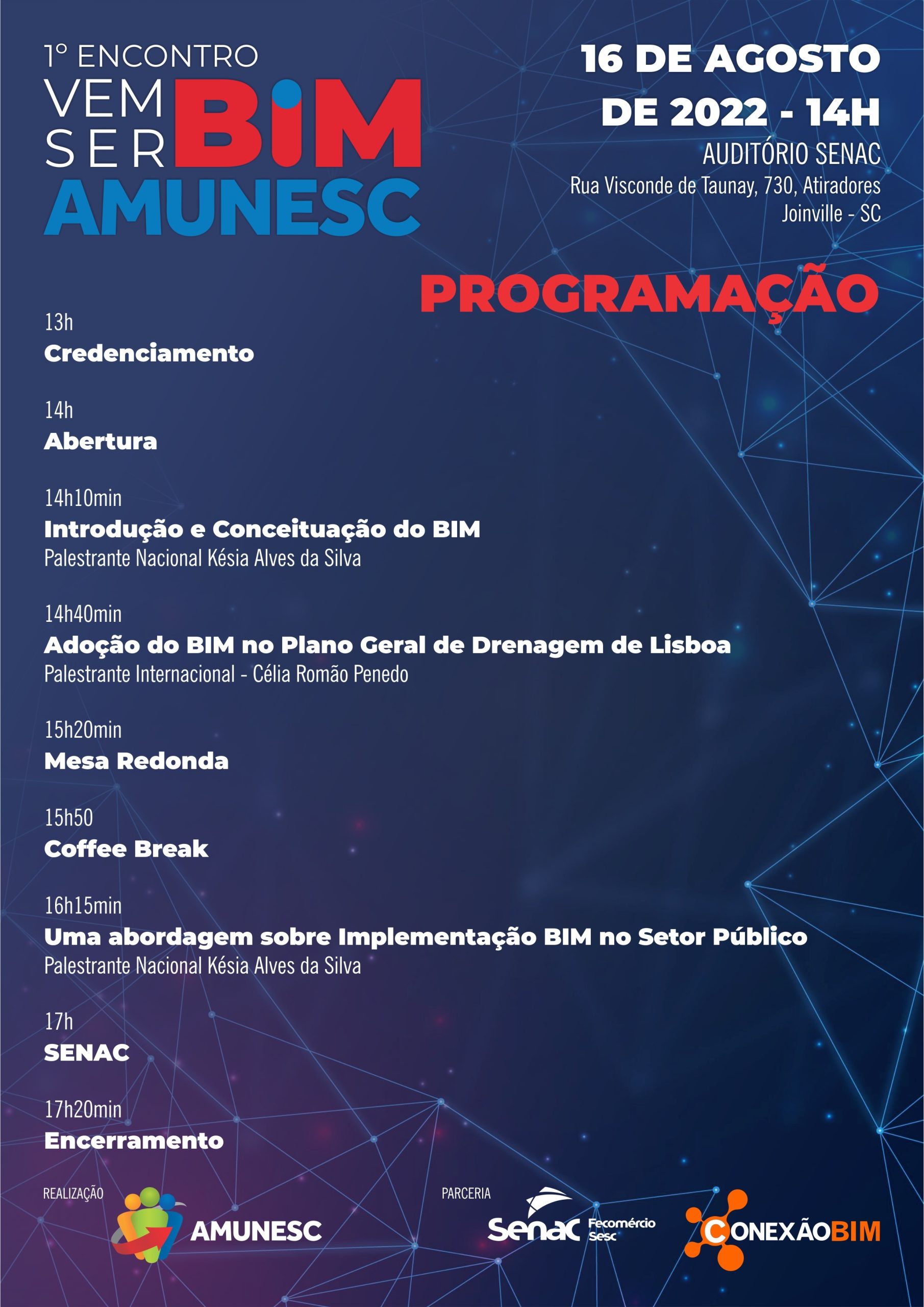 Neste primeiro ano do encontro a AMUNESC, buscando promover e enfatizar ainda mais a importância da implementação desta metodologia nas prefeituras, contará com a participação de duas palestrantes (uma de notoriedade nacional e outra internacional) que trarão diversos exemplos de projetos nacionais e internacionais como a Adoção do BIM no Plano Geral de Drenagem de Lisboa, e abordarão também sobre a Conceituação do BIM e a Implementação do BIM no Setor Público.