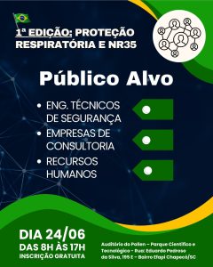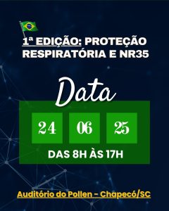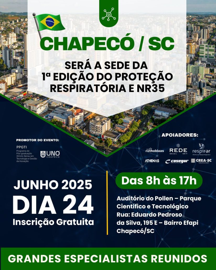 Acontece no dia 24 de junho, em Chapecó/SC, a 1ª edição do evento Proteção Respiratória e NR35. Um evento essencial para profissionais de segurança, engenharia e saúde ocupacional, com grandes especialistas do setor.