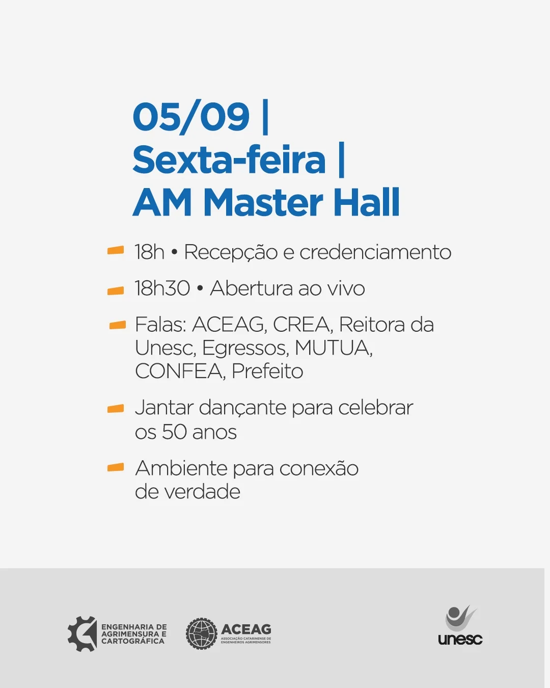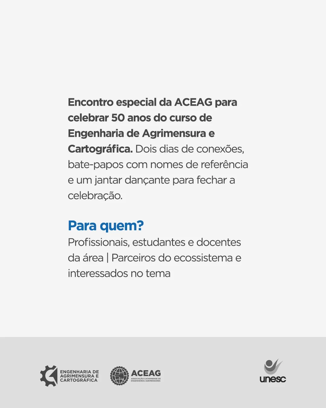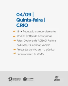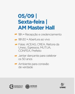 Nos dias 04 e 05/09, a ACEAG reúne profissionais, estudantes e parceiros para dois encontros ao vivo, conteúdo direto ao ponto, conexões reais e um jantar dançante para fechar a celebração.