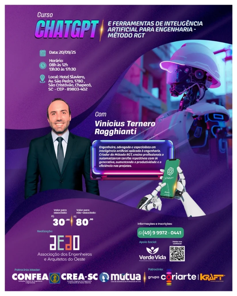 A AEAO tem a honra de trazer para Chapecó, Vinicius Ragghianti, engenheiro, advogado e especialista em Inteligência Artificial aplicada à engenharia. Criador do método RGT, ensina os profissionais a automatizarem tarefas repetitivas com a IA generativa, aumentando a produtividade e a eficácia em seus projetos.