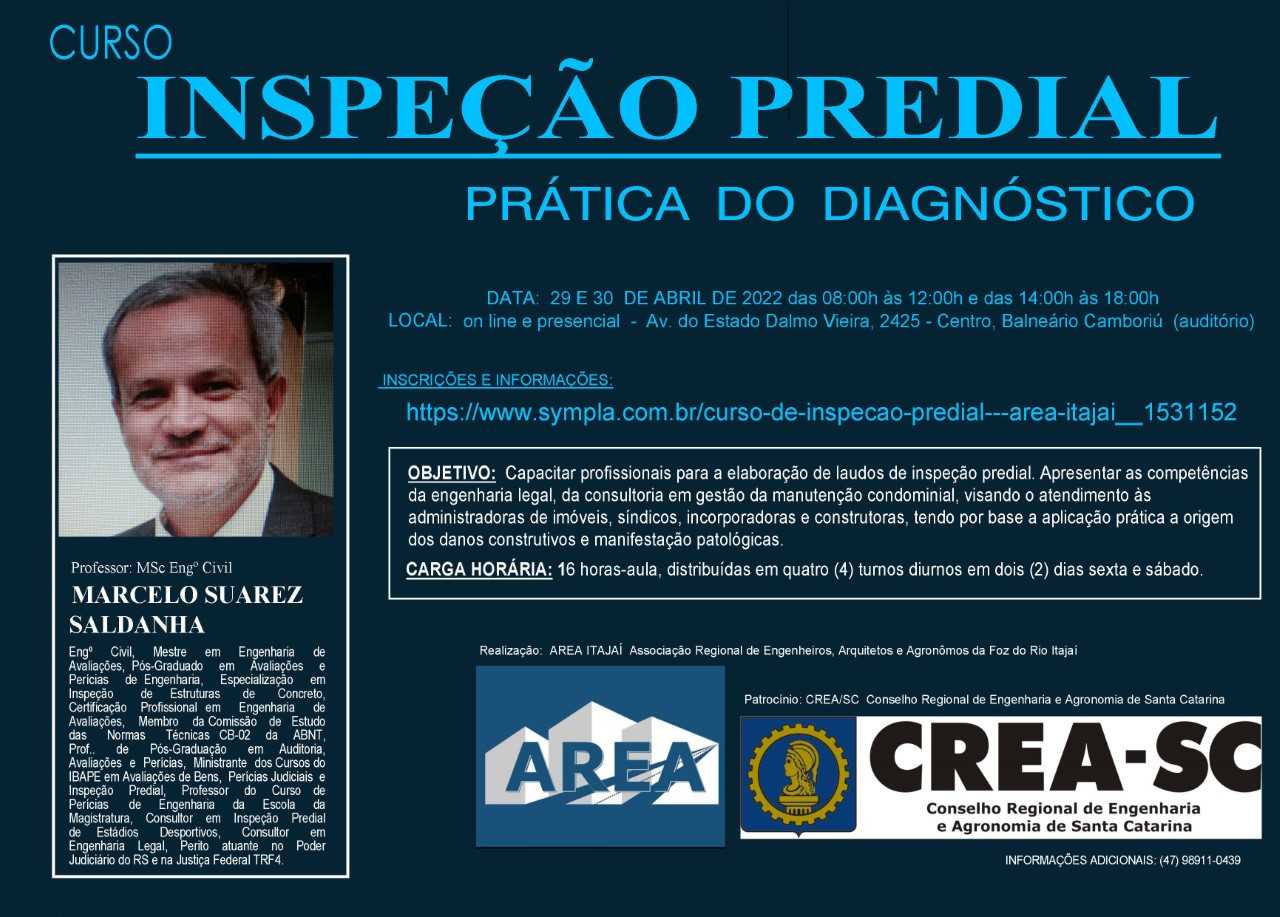 OBJETIVO:  Capacitar profissionais para a elaboração de laudos de inspeção predial. Apresentar as competências da engenharia legal, da consultoria em gestão da manutenção condominial, visando o atendimento às administradoras de imóveis, síndicos, incorporadoras e construtoras, tendo por base a aplicação prática a origem dos danos construtivos e manifestação patológicas.