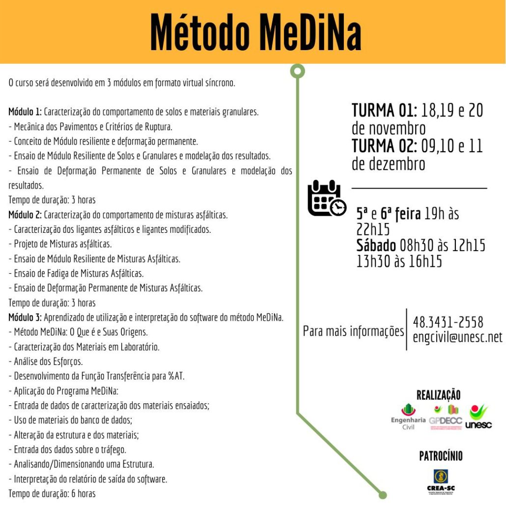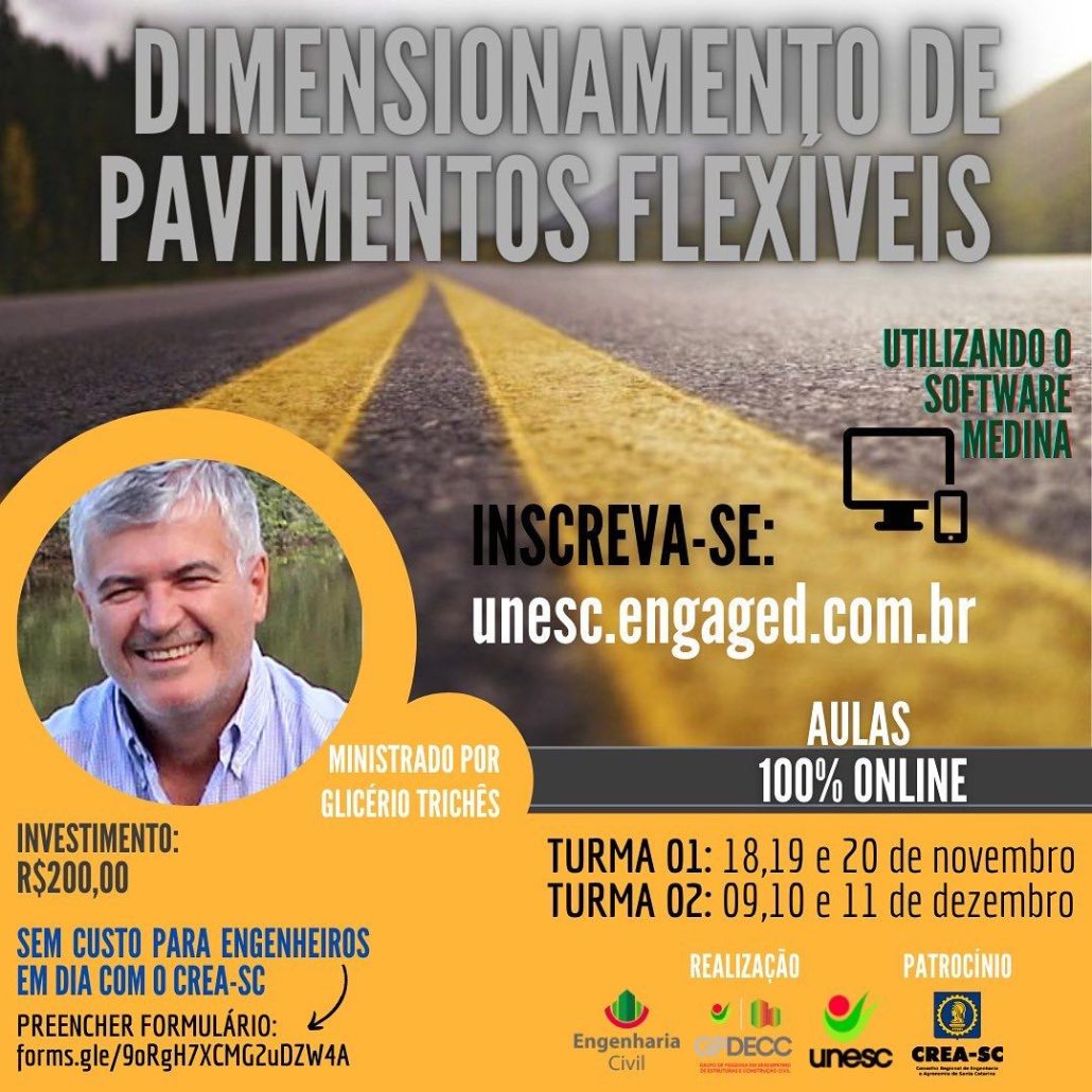 O curso “Dimensionamento de pavimentos flexíveis utilizando o software MeDiNa” está sendo organizado pelo curso de Engenharia Civil UNESC – GPDECC, UNESC e com patrocínio do CREA-SC.