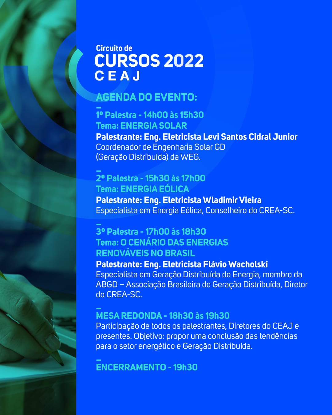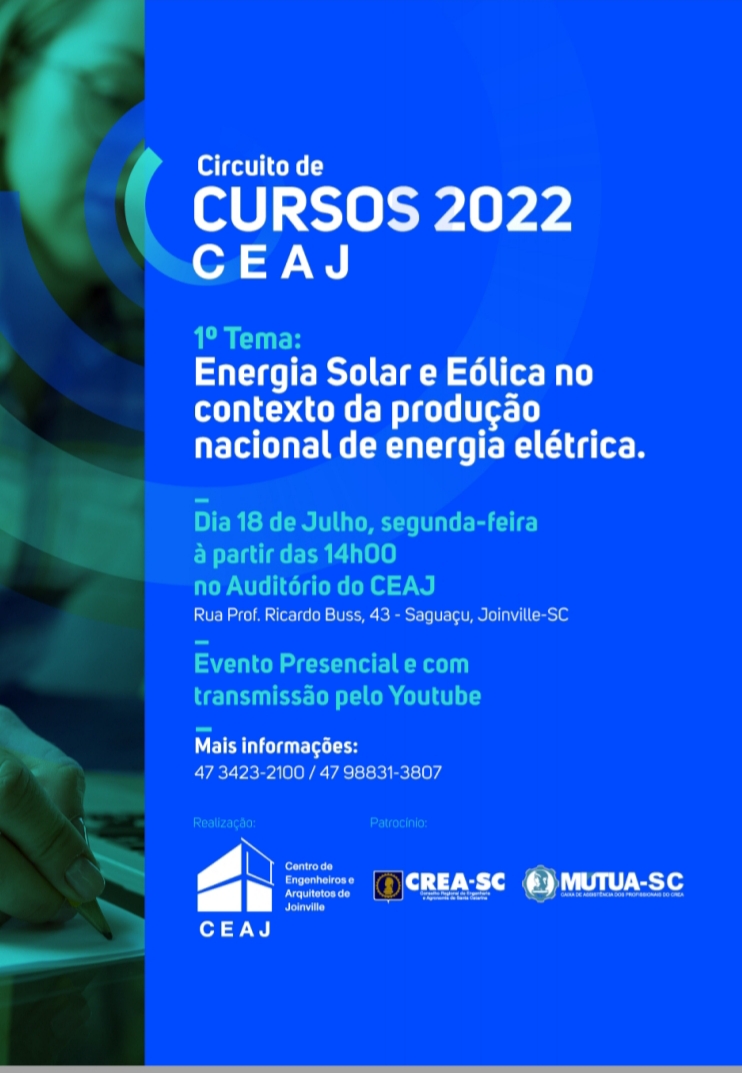 O Centro de Engenheiros e Arquitetos de Joinville realiza no dia 18 de julho, a partir das 14h, o curso sobre Energia Solar e Eólica no contexto da produção nacional de energia elétrica. O encontro será presencial no auditório da entidade e transmitido ao vivo pelo Youtube.
