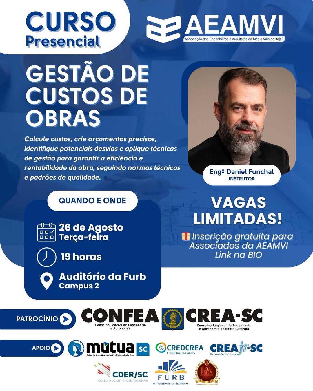 O curso será realizado presencialmente em Blumenau, no Auditório do Campus 2 da Furb, direcionado para associados e profissionais convidados da AEAMVI.