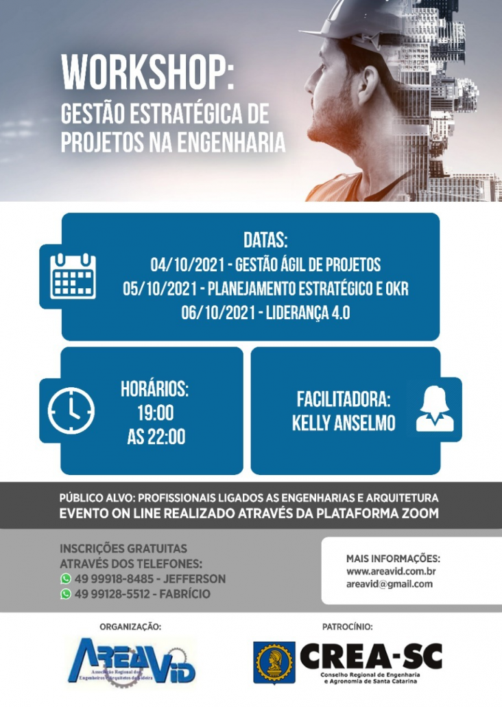 Profissionais ligados as engenharias e arquitetura de Videira e região terão mais uma oportunidade de atualização profissional. A Associação Regional de Engenheiros e Arquitetos de Videira – AREAVID, com patrocínio do CREA/SC realiza nos dias 04,05 e 06 de outubro, sempre das 19h às 22h, o workshop: “Gestão estratégica de projetos na engenharia”. O evento acontecerá de forma online e é aberto à associados ou não.