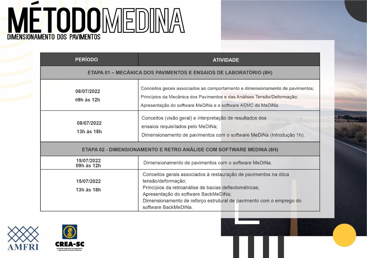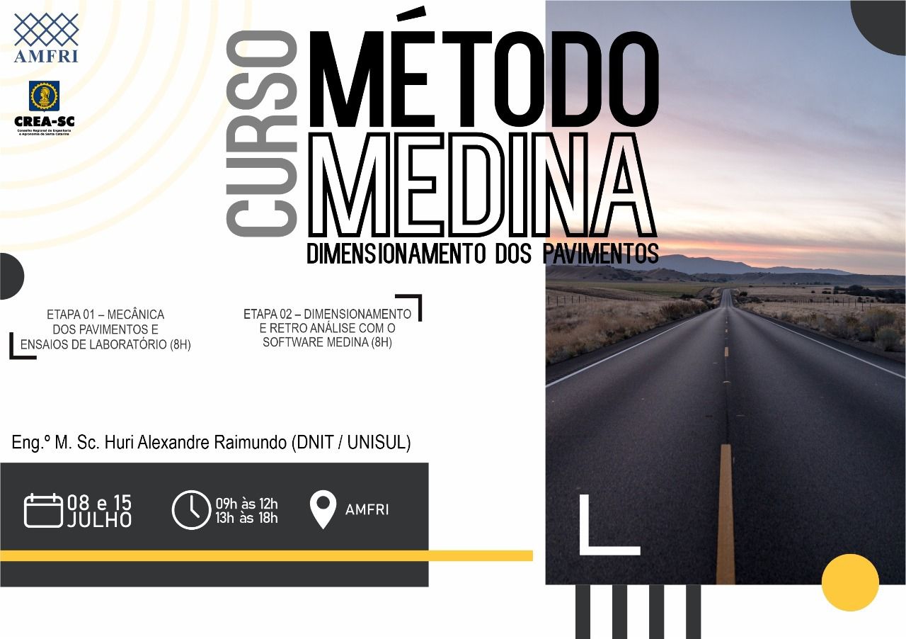 Nos dias 8 e 15 de julho, das 9h às 12h e das 13h às 18h, a Associação dos Municípios da Região da Foz do Rio Itajaí (AMFRI), por meio do setor de Engenharia e Arquitetura, promove o curso sobre o novo Método de Dimensionamento Nacional de Pavimentos (Medina), oficializado pelo Departamento Nacional de Infraestrutura de Transportes (DNIT), em abril de 2021. O curso será realizado no auditório da AMFRI e é destinado aos servidores públicos da região, com inscrições gratuitas e limitadas a 50 participantes.