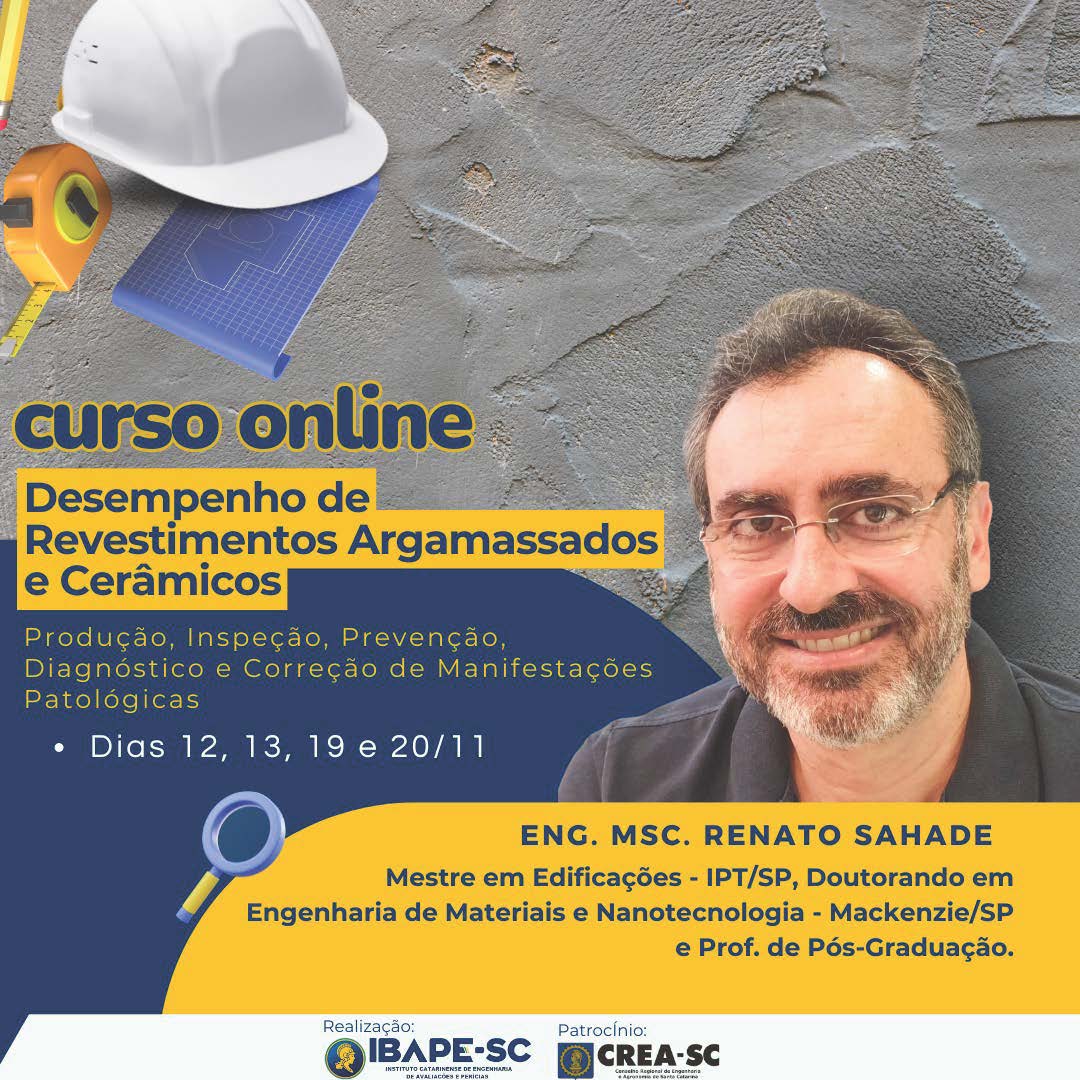 Informações  https://ibape-sc.org.br/cursos/desempenho-de-revestimentos-e-estruturas-de-concreto-producao-inspecao-prevencao-diagnostico-e-correcao-de-manifestacoes-patologicas/