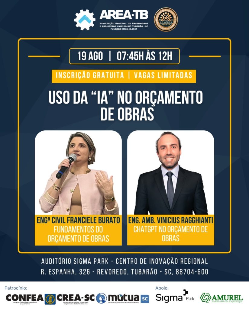 No dia 19 de agosto, com patrocinio do CREA-SC, Tubarão recebe o curso “Uso da IA no Orçamento de Obras”, com especialistas em inteligência artificial e construção civil.