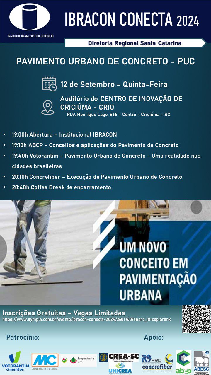 Evento técnico destinado à divulgação da tecnologia de pavimento urbanos de concreto (PUC), seus conceitos, técnicas de aplicação, detalhes executivos, aplicações e seus benefícios. Momento de troca de experiência com profissionais com grande experiência na área, trazendo o panorama do PUC no estado de SC e a perspectiva do mercado futuro.