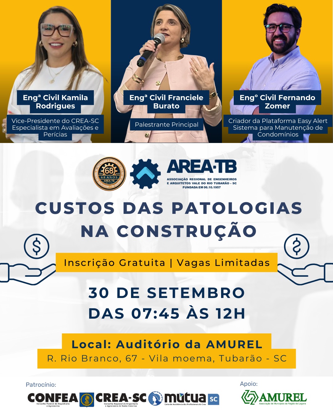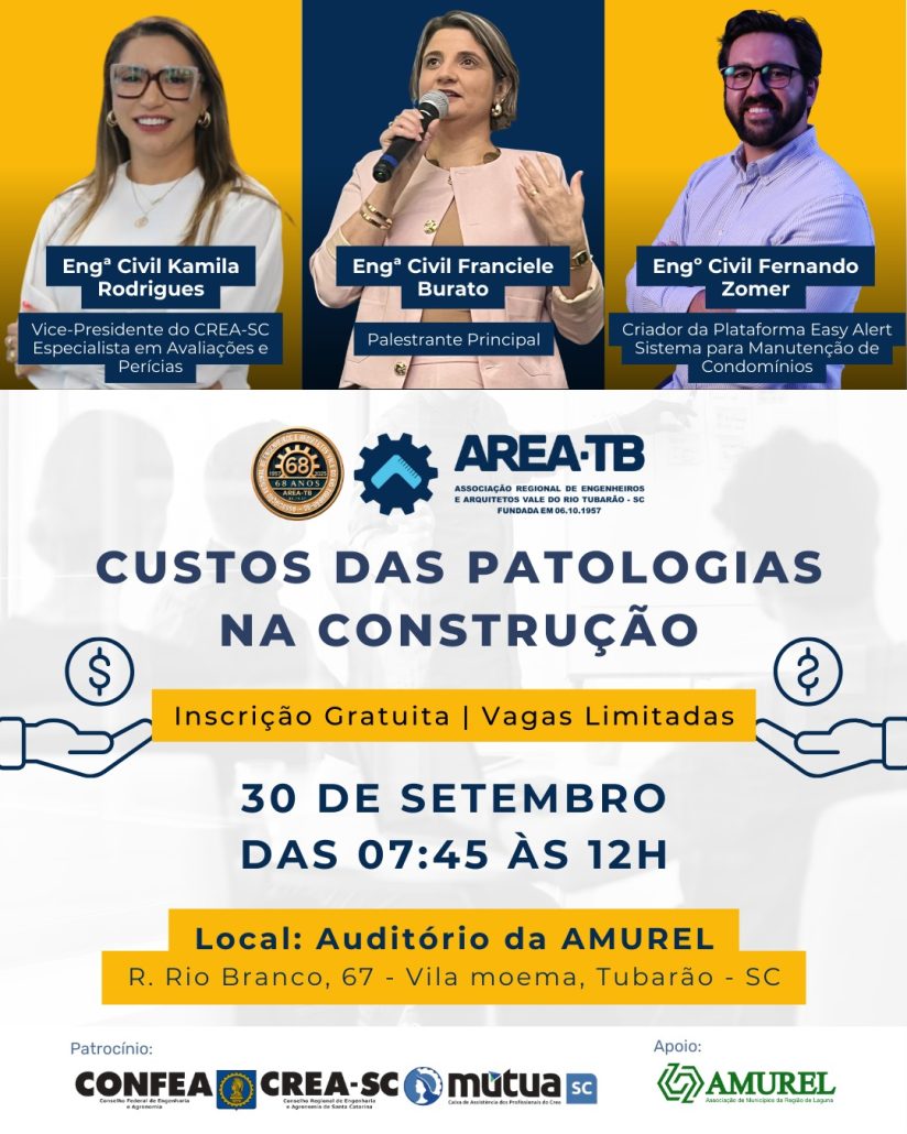 No dia 30/09, em Tubarão/SC, acontece a palestra “Custos das Patologias na Construção”, com especialistas que são referência na área.