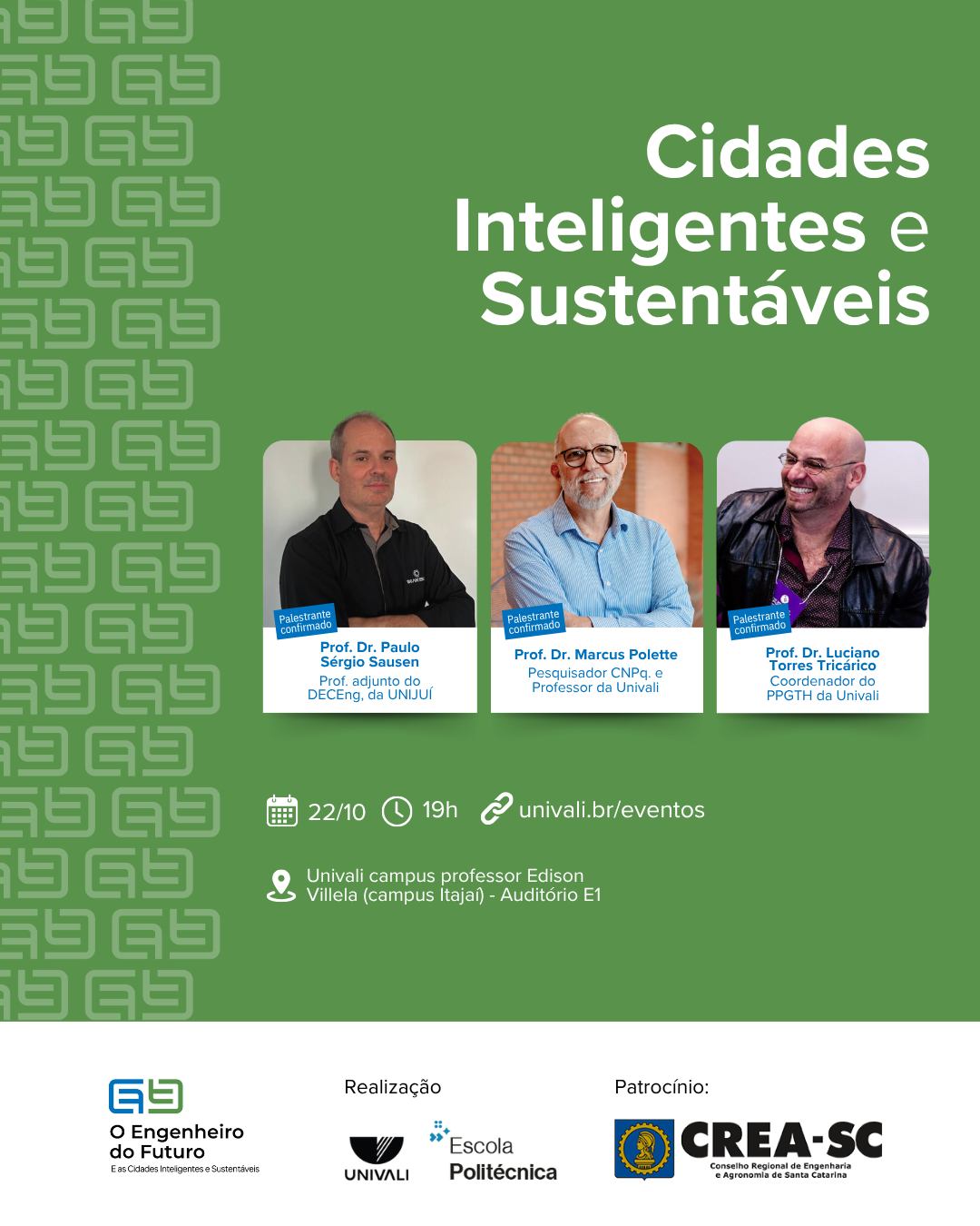 Entre os convidados, estão os professores Dr. Paulo Sérgio Sausen (UNIJUÍ), Dr. Marcus Polette (UNIVALI) e Dr. Luciano Torres Tricárico (UNIVALI), referências em suas áreas, que trarão reflexões sobre tecnologia, meio ambiente e planejamento urbano.