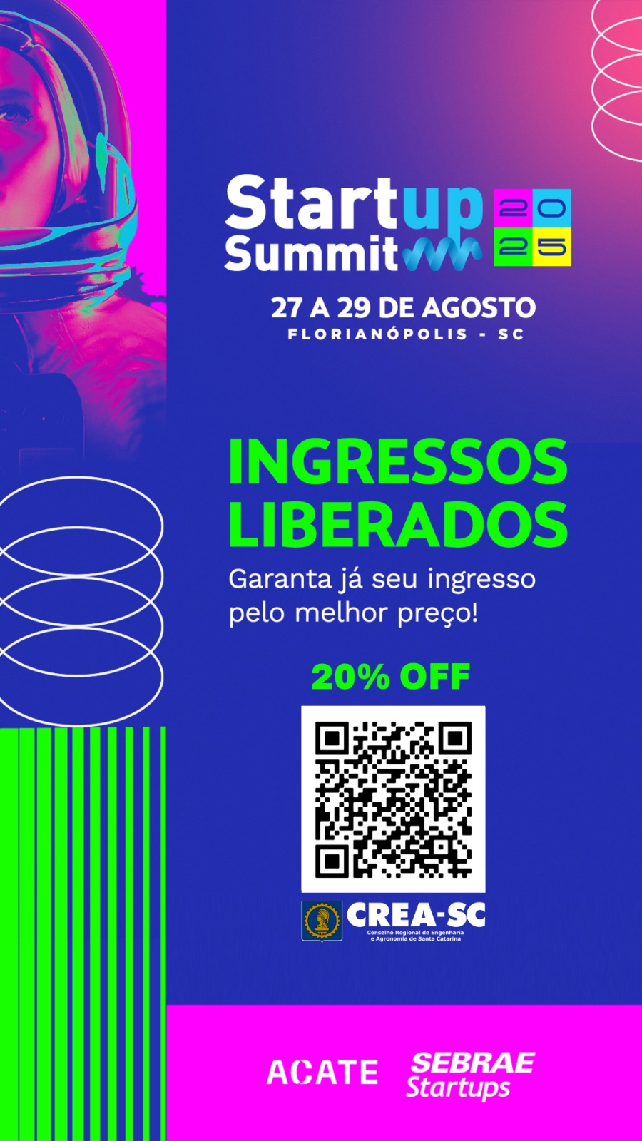 O Sebrae, em parceria com o CREA-SC, por meio do programa CREA Acelera, está oferecendo uma condição imperdível para os seus associados: 20% de desconto nos ingressos do Startup Summit 2025, o maior evento de inovação e empreendedorismo do Brasil!