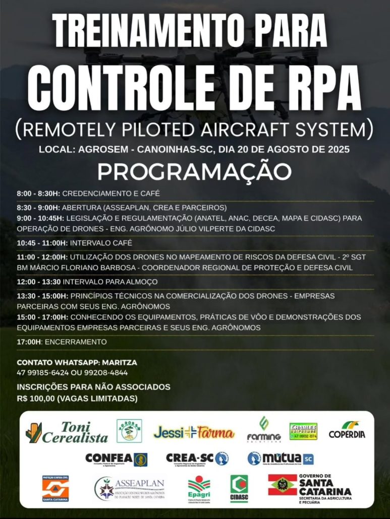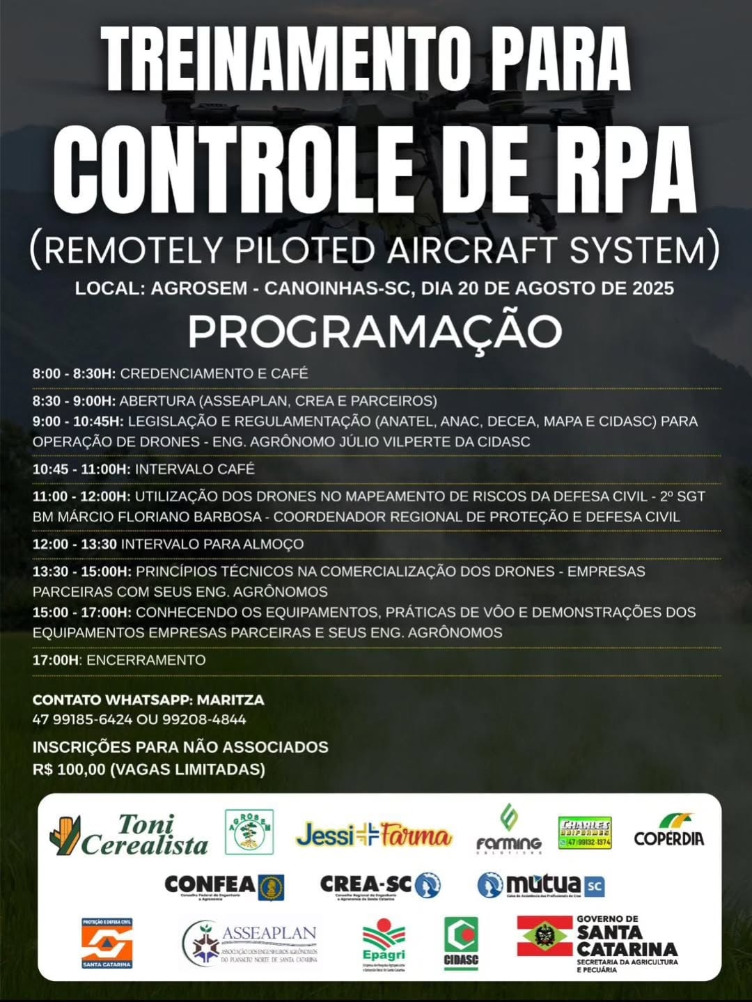 Participe de um dia completo de aprendizado sobre legislação, segurança, aplicações técnicas e demonstrações práticas com drones voltadas à agricultura, defesa civil e uso comercial!