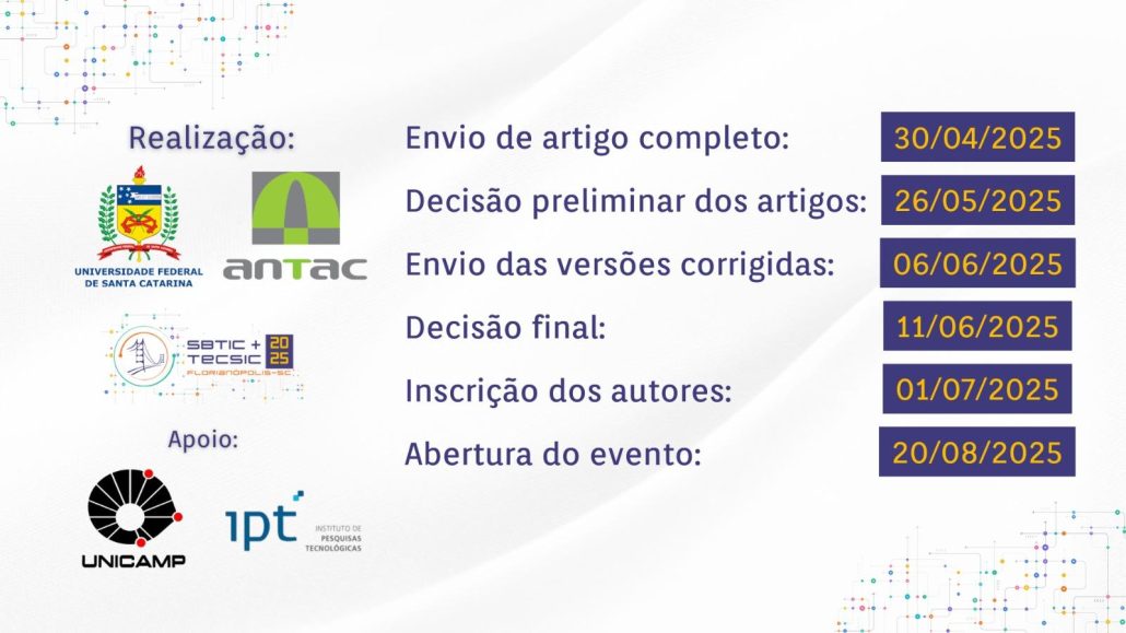 Com o tema “Industrialização, Digitalização, Desempenho”, o SBTIC+TECSIC 2025 oferece uma plataforma única de convergência entre a academia, mercado e inovação tecnológica na construção civil, com o objetivo de promover a integração entre esses atores na busca por soluções inovadoras e colaborativas para o setor.