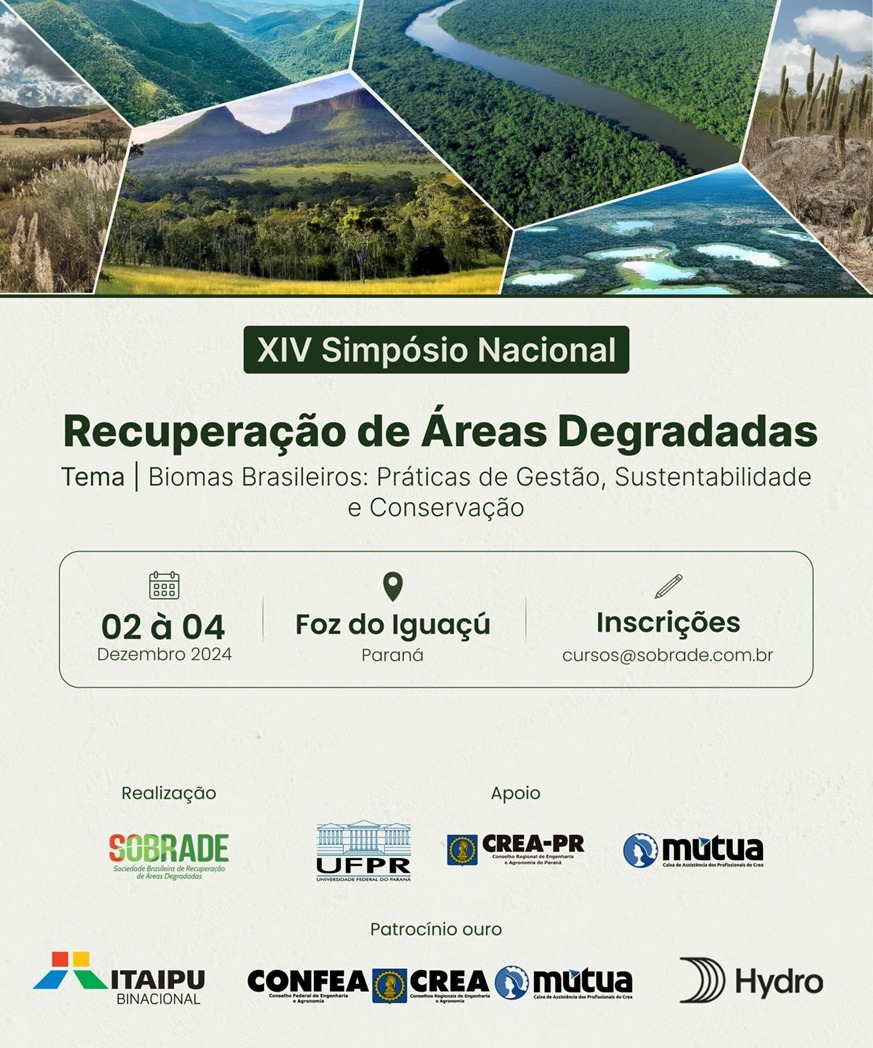 A Sociedade Brasileira de Recuperação de Áreas Degradadas – SOBRADE irá realizar nos dias 2 a 4 de dezembro/24 em Foz do Iguaçu-PR a 14ª edição do Simpósio Nacional sobre Recuperação de Áreas Degradadas.