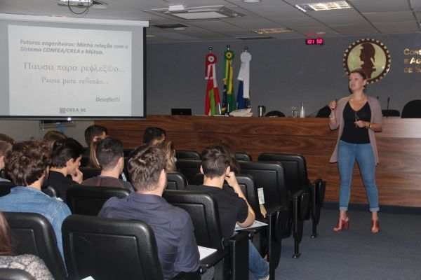 A palestra foi ministrada pela Eng. Civil Caroline Burtet, assessora de relações institucionais do Conselho abordando temas como responsabilidade, ética, atribuições e legislação profissional. Participação do presidente do CREA-SC, Eng. Civil e Seg. Trab. Carlos Alberto Kita Xavier. Os estudantes que participara da palestra terão um desconto de 90% na primeira anuidade.