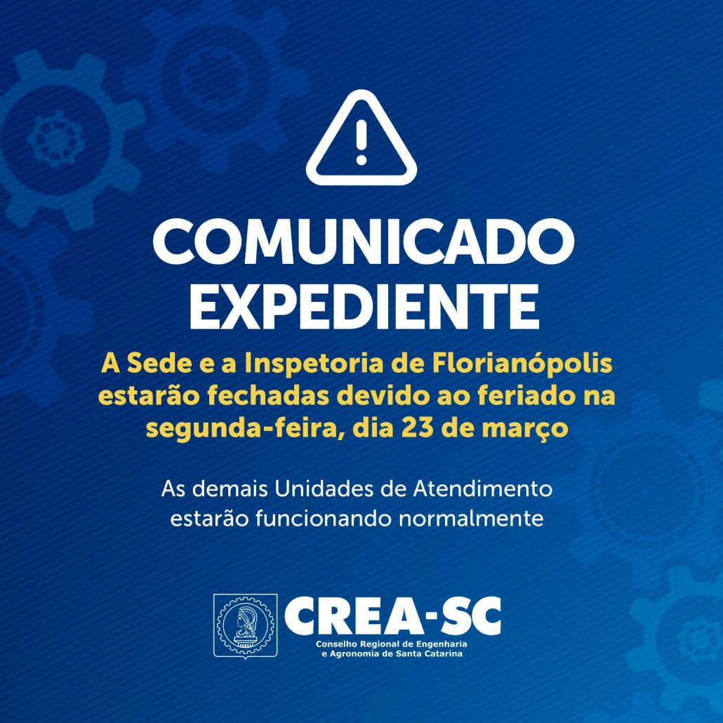 Informamos aos profissionais que dia 23.03 não haverá expediente na sede do Conselho e nas inspetorias de Florianópolis, devido ao feriado municipal e de Caçador (feriado municipal dia 25 antecipado para dia 23.03). Serviços on-line continuam funcionando normalmente, bem como as outras unidades no estado.