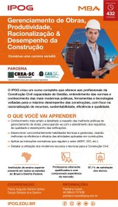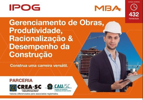 O IPOG – Instituto de Pós-Graduação, informa o processo final de matrículas para a 10ª turma em Florianópolis do MBA Gerenciamento de Obras, Racionalização e Desempenho da Construção – curso que é referência no País com mais de 150 turmas inauguradas. Início confirmado em 12/07.