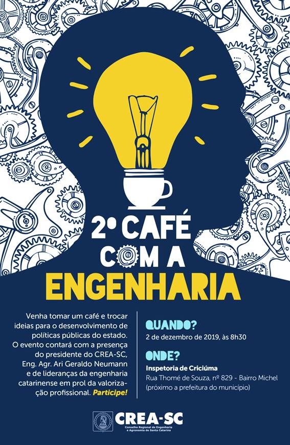 O CREA-SC realiza hoje (2), na Inspetoria Regional de Criciúma, a 2ª edição do evento Café com a Engenharia. Idealizado pela Comissão de Valorização Profissional, o encontro tem como objetivo, reunir profissionais da região para debater sobre políticas públicas e trocar ideias para o desenvolvimento do estado. Em pauta, temas como ensino à distância, fiscalização, salário mínimo profissional, engenharia pública, valorização profissional e outros.