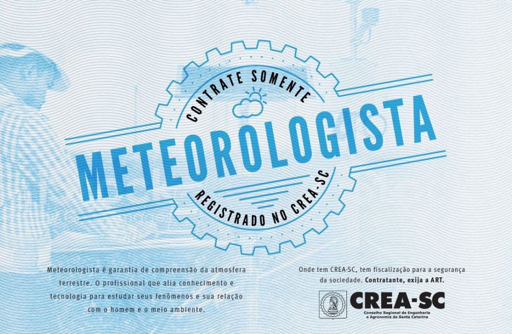 Inicia na próxima quarta-feira, 27.03 e segue até dia 5.04 a veiculação do material institucional de valorização profissional referente à Meteorologia. As peças fazem parte da campanha “Contrate somente profissional registrado no CREA-SC”, lançada em outubro de 2018 e que será exibida até maio deste ano. Já foram divulgados anúncios dos profissionais engenheiros (as) agrônomos, civis, florestais, eletricistas, ambientais, de alimentos, químicos, de minas, agora meteorologistas, agrimensores, geólogos, geógrafos e sanitaristas. O material é veiculado nas principais emissoras de TV, mídias sociais, jornais e rádios do estado.