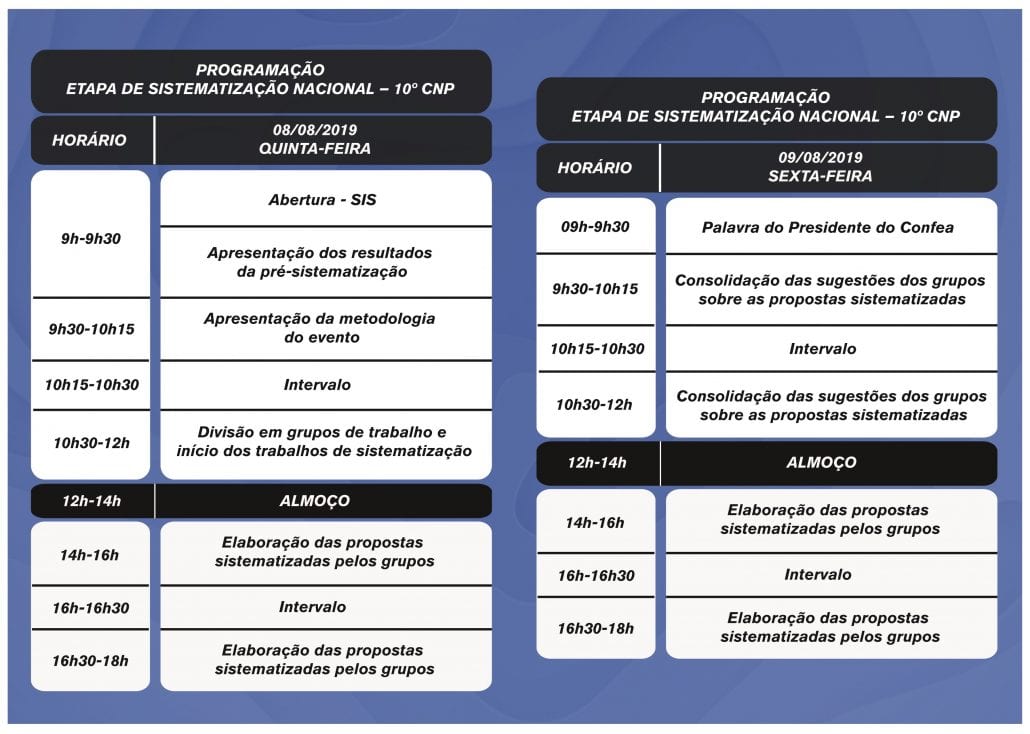 Após a realização da primeira etapa do 10º CNP, da qual resultarão os anteprojetos de leis e as minutas de resoluções, será realizada uma oitiva sobre os documentos em todos os estados, e recolhidas contribuições para o aprimoramento das respectivas redações.