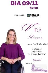 Vida Acessível foi o tema da palestra realizada pelo Comitê Mulher do CREA-SC – Regional de Criciúma, no dia 09.11, na sede da Inspetoria de Criciúma. O evento contou com a participação da diretora de Criciúma e coordenadora adjunta do Colégio de Diretores Regionais (CDR), Eng. Civil Kamila Rodrigues da Silva.