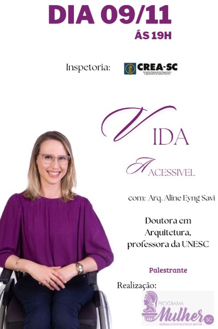 Vida Acessível foi o tema da palestra realizada pelo Comitê Mulher do CREA-SC – Regional de Criciúma, no dia 09.11, na sede da Inspetoria de Criciúma. O evento contou com a participação da diretora de Criciúma e coordenadora adjunta do Colégio de Diretores Regionais (CDR), Eng. Civil Kamila Rodrigues da Silva.