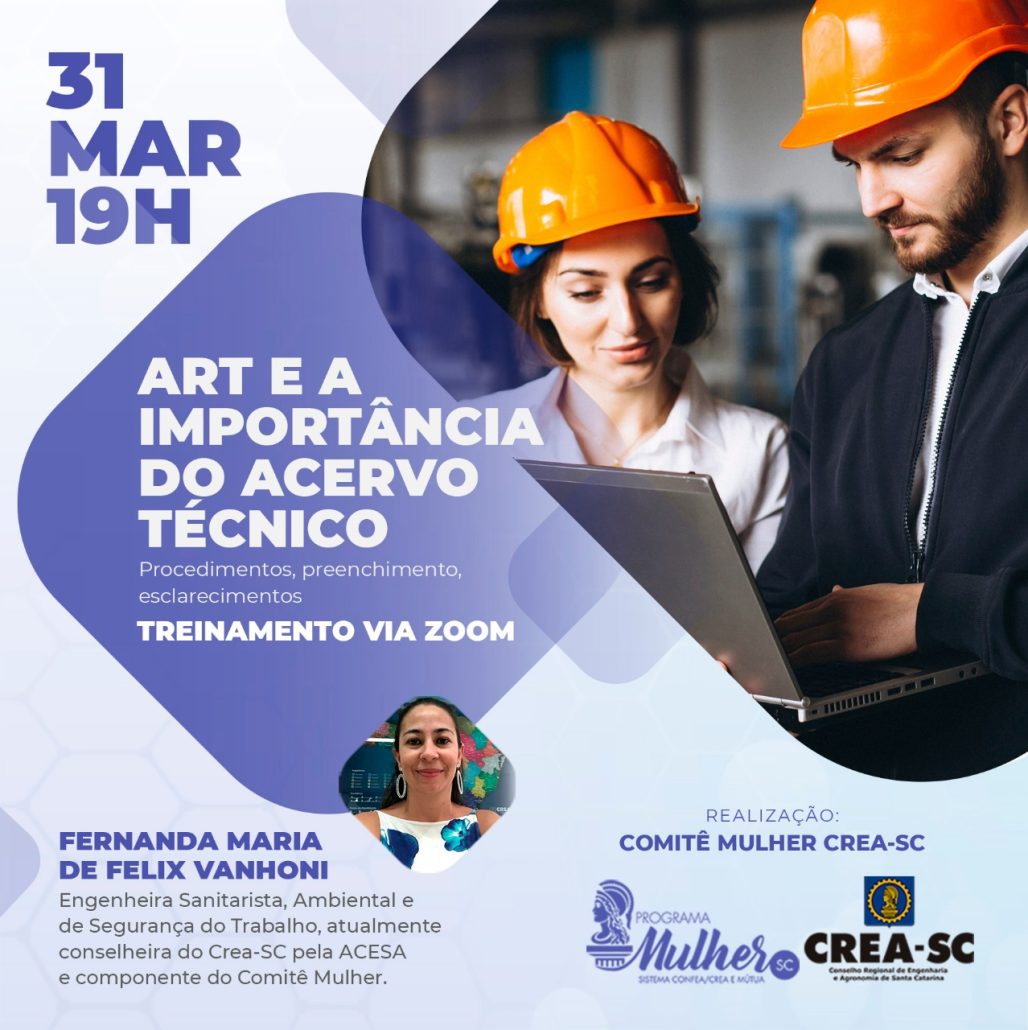 O Comitê Mulher do Crea-SC realiza na próxima quinta-feira, 31.03, às 19h, uma capacitação aberta ao público sobre ART e acervo técnico. A facilitadora será a Eng. Sanit. Amb. e de Seg. do Trab. Fernanda Maria de Felix Vanhoni, conselheira do Crea/SC pela Associação Catarinense de Engenheiros Sanitaristas e Ambientais (ACESA) e componente do Comitê.