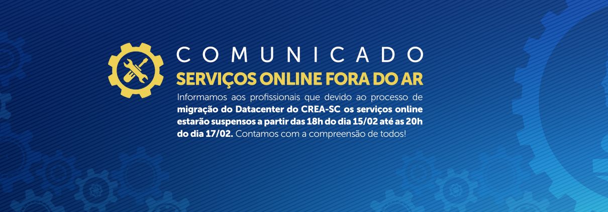 Informamos aos profissionais que devido ao processo de migração do Datacenter do CREA-SC os serviços online estarão suspensos a partir das 18h do dia 15/02 até as 20h do dia 17/02. Contamos com a compreensão de todos!