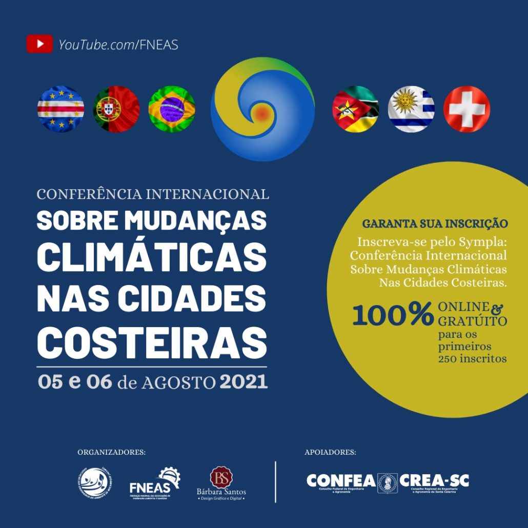 Vem ai, a Conferência Internacional sobre as Mudanças Climáticas nas Cidades Costeiras. O evento acontecerá nos dias 05 e 06 de Agosto de 2021 e irá apresentar oficialmente a parceria entre a Associação dos Engenheiros do Ambiente de Moçambique (AEAMO) e a Federação Nacional de Engenharia Ambiental e Saniária (FNEAS). Além disso, buscará estimular o publico alvo a debater sobre as mudanças climáticas por meio da disseminação de informações acerca dos desastres naturiais e seus impactos sobre a economia e recursos naturais, reforçando também a conscientização e medidas de mitigação e adaptação aos riscos relacionados às mudanças climáticas.
