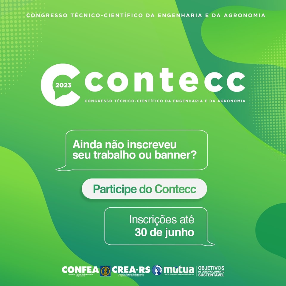 Profissionais, estudantes e professores das áreas da Engenharia, Agronomia e Geociências interessados em participar do Contecc 2023 podem enviar os trabalhos pelo link contecc.confea.org.br até 30 de junho de 2023.