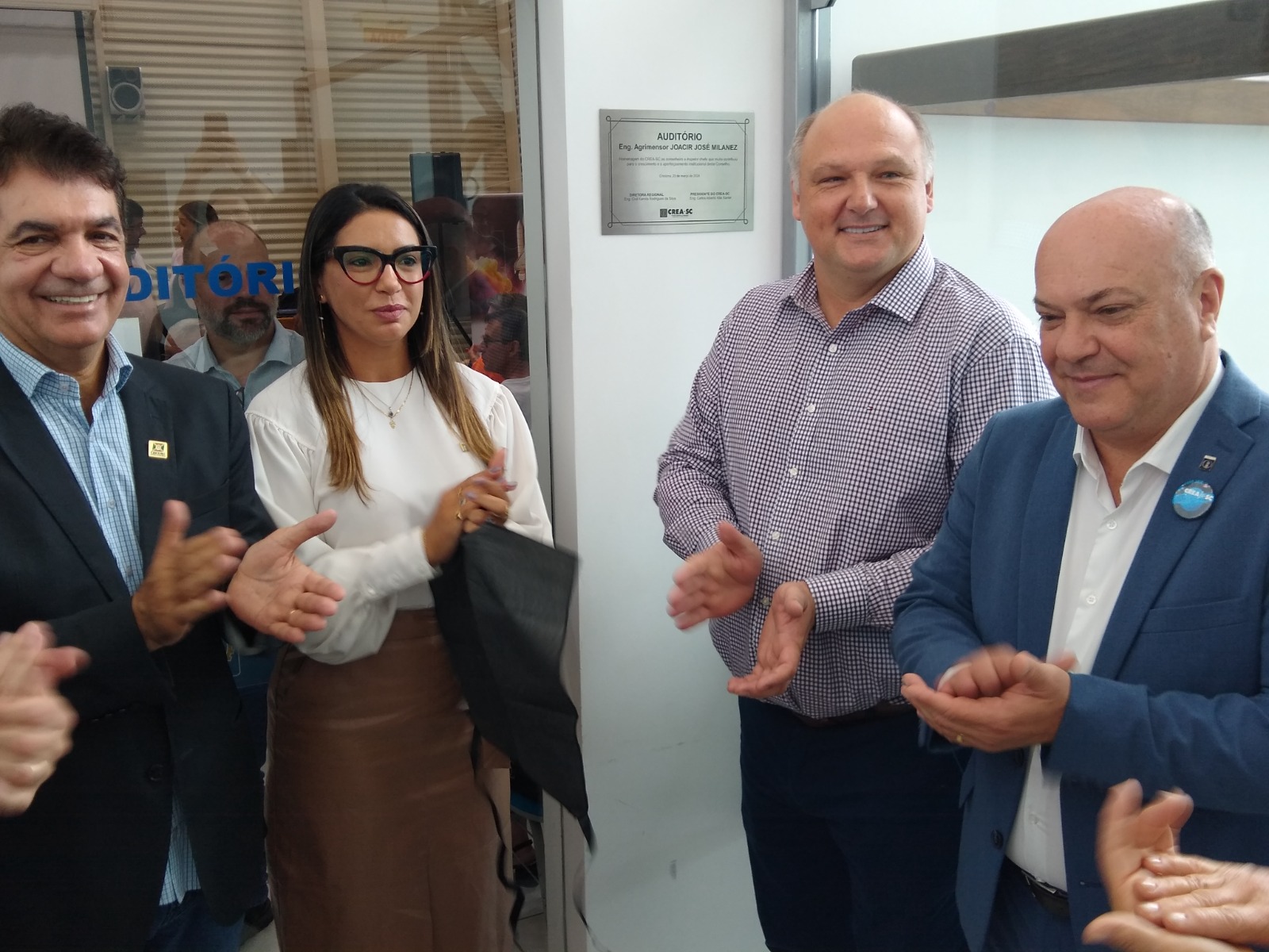 Também foi realizado o descerramento da placa nomeando o Auditório da Inspetoria, homenageando o ex-conselheiro e diretor regional, Eng. Agrim. Joacir José Milanez, representado pelo Eng. Agrim. Ricardo Manente Milanez (filho), Fernanda (filha), Nair (esposa) e pela neta Antonela. Na mesma data foi realizada também a posse do Colegiado de Inspetores Regionais de Criciúma.