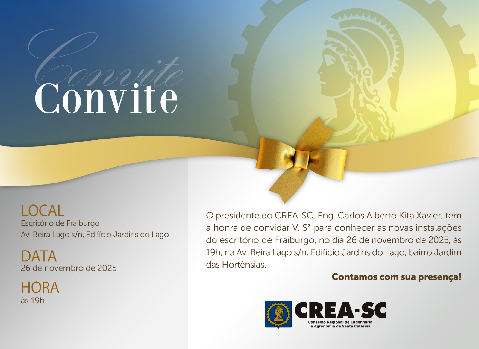 A cerimônia contará com a presença do presidente do CREA-SC, Eng. Kita Xavier, do Inspetor-Chefe de Fraiburgo, Eng. Civil Paulo Henrique Steinwandter, do Inspetor-Chefe de Videira, Eng. Agrimensor Valdir Pedro Schneider, além de autoridades, representantes de entidades e instituições de ensino, profissionais e colaboradores.