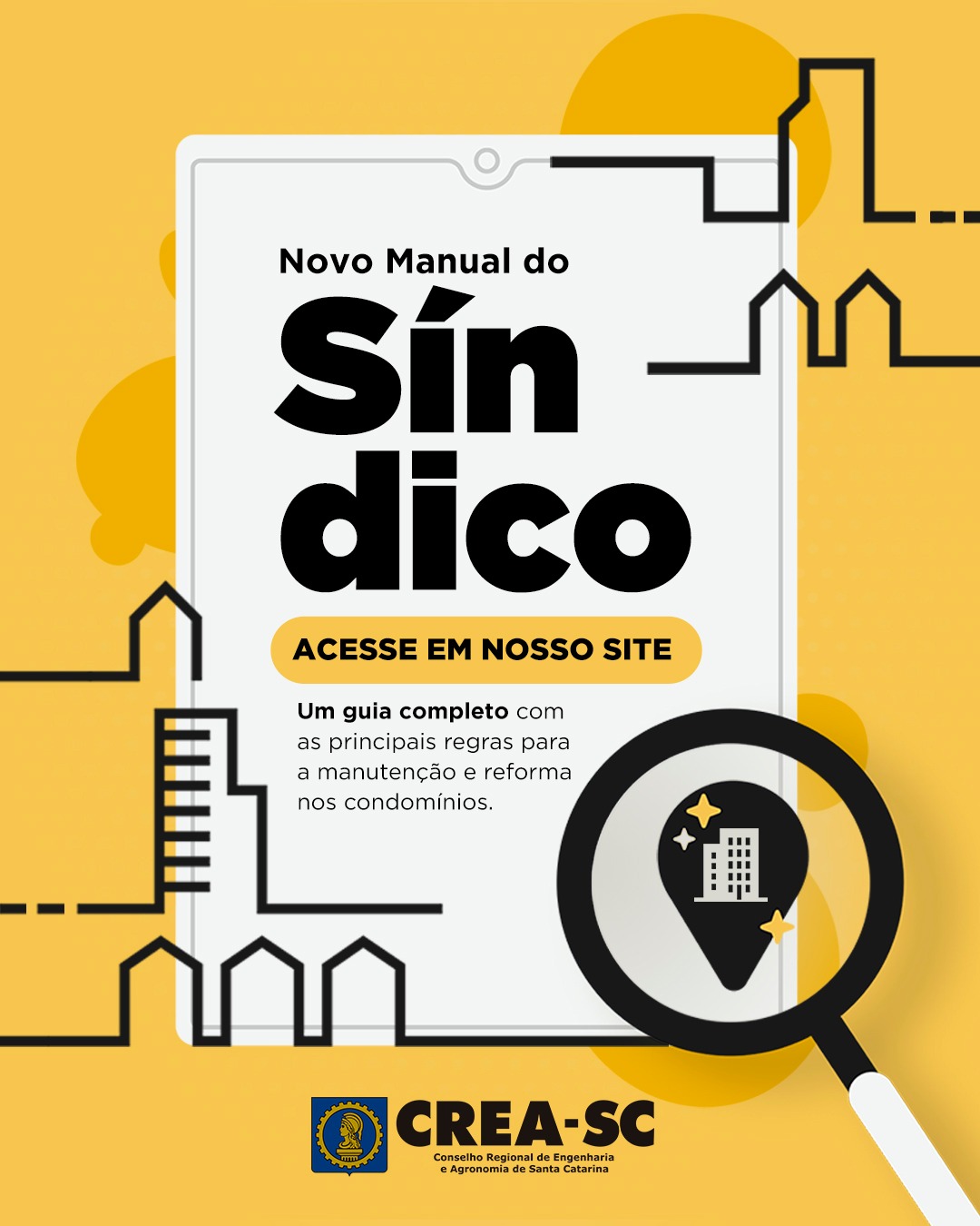 O CREA-SC está lançando a 4ª edição do Manual do Síndico, totalmente revisada e atualizada. A edição traz o que há de mais novo em legislação e sua correta interpretação, as normas, prazos e procedimentos para obras, manutenção e reforma nos condomínios. “Nosso foco é a segurança. Temos a responsabilidade de fiscalizar e valorizar o exercício dos profissionais de engenharia, agronomia e geociências, mas queremos ir sempre além. Por isso, o CREA-SC está lançando uma nova edição do Manual do Síndico”, diz o presidente do Conselho, Eng. Civil e Seg. Trab. Kita Xavier.
