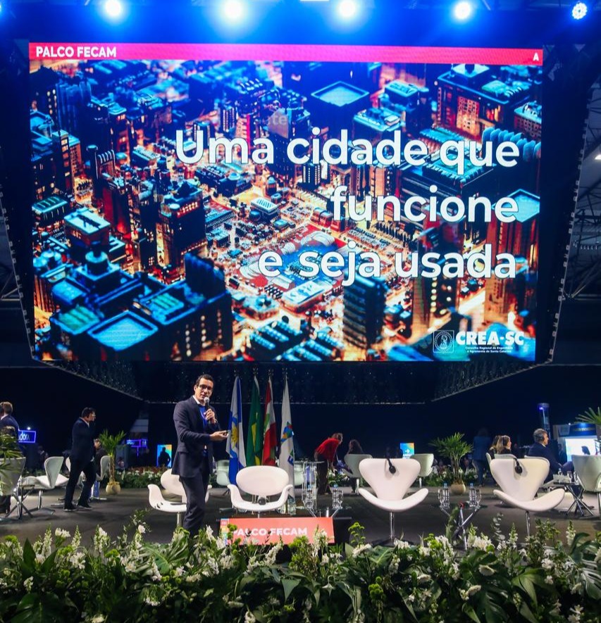 O Head de Inovação do CREA-SC, Rhuan Bittencourt, apresentou a palestra “Engenharia e Inovação nas Cidades”, destacando como a Engenharia a Agronomia e Geociências desempenham papel central na construção de cidades mais humanas, sustentáveis e inteligentes.