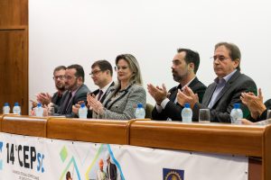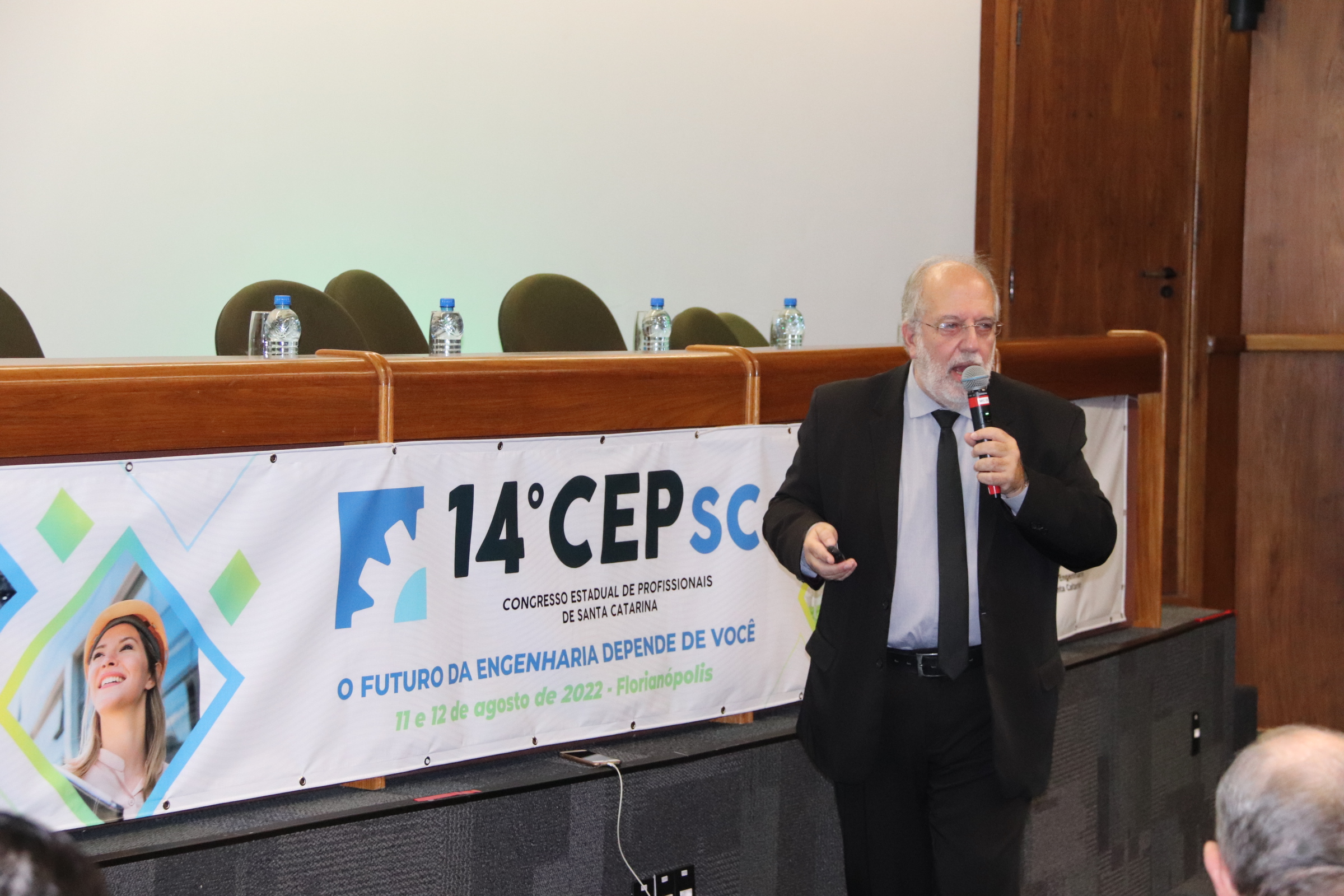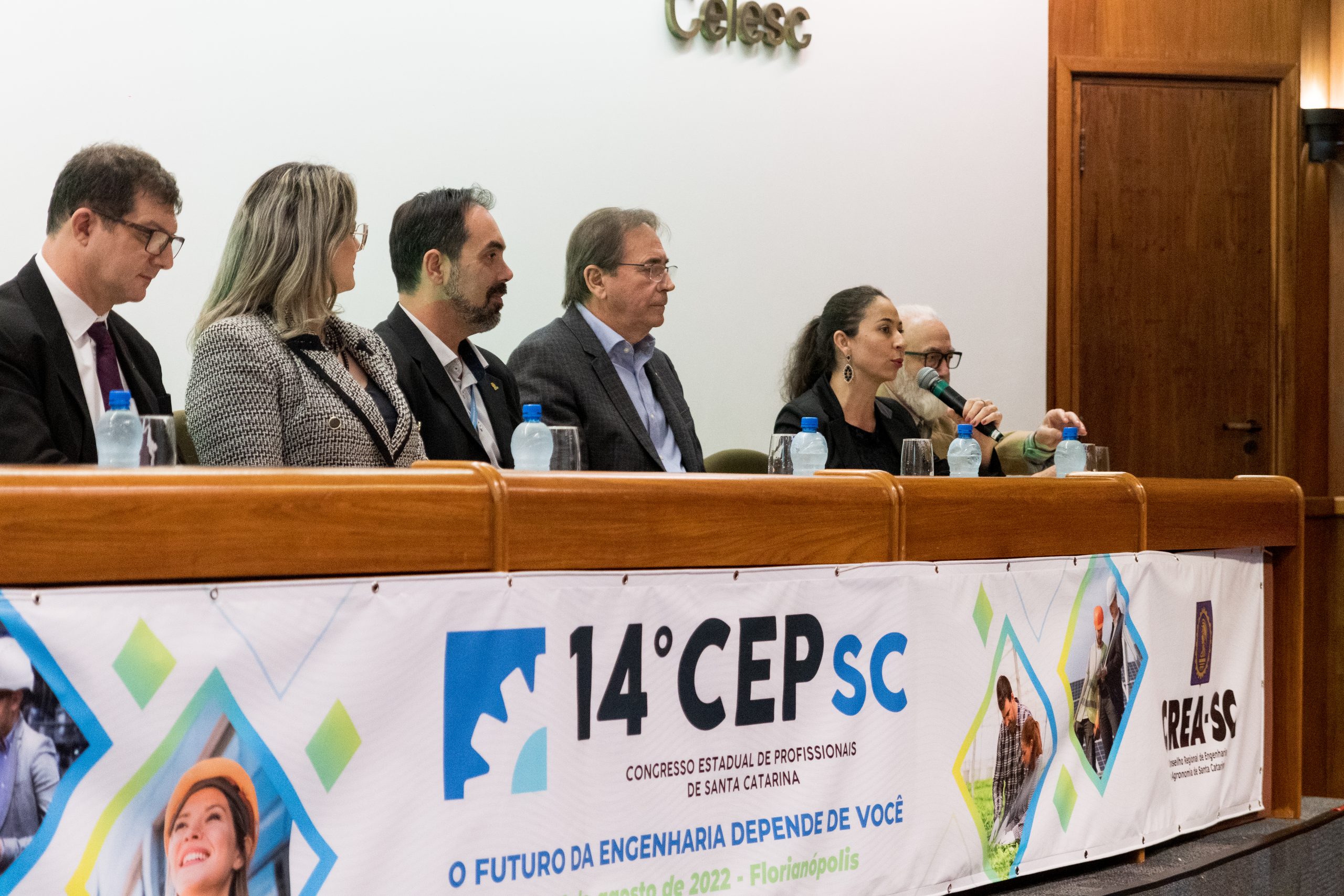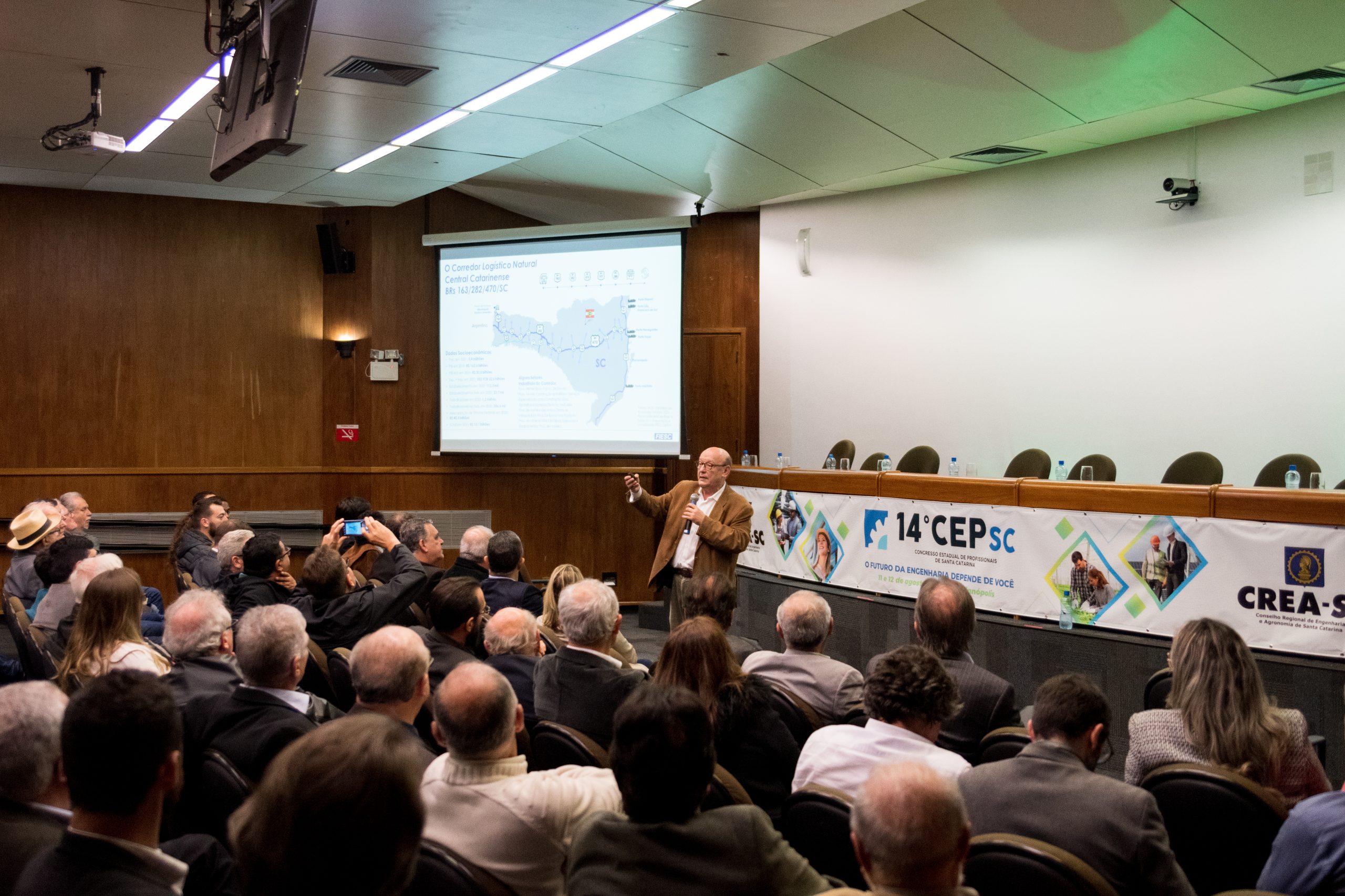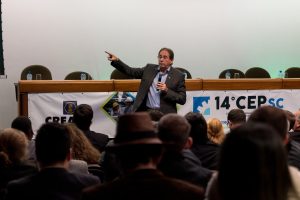 O 14 CEP iniciou às 19h de quinta-feira com a palestra “Infraestrutura no Estado de SC”, ministrada pelo presidente da FIESC, Eng. Civil Mário Cesar Aguiar. Formaram a mesa de abertura a presidente em exercício do CREA-SC, Engª Agrª Angela Cristina Paviani; o conselheiro federal Eng. Eletric. Evânio Ramos Nicoleit, representando o Confea; a coordenadora da Comissão Organizadora do 14º CEP, Eng. Sanitarista Amb. e de Seg. do Trab. Fernanda Vanhoni; o coordenador estadual adjunto do Colégio de Entidades Regionais de Santa Catarina- CDER, Eng. Agr. Valdir Silveira Ávila; o diretor de Distribuição da Celesc, Eng. Marco Aurélio Gianesini; o presidente da Cidasc, Eng. Agr. Junior Kunz; o diretor geral da Mútua-SC, Eng. Civil Carlos Koyti Nakazima e o presidente da Feagro, Eng. Agr. Athos de Almeida Lopes Filho, representando o presidente da Alesc, além do presidente da FIESC.