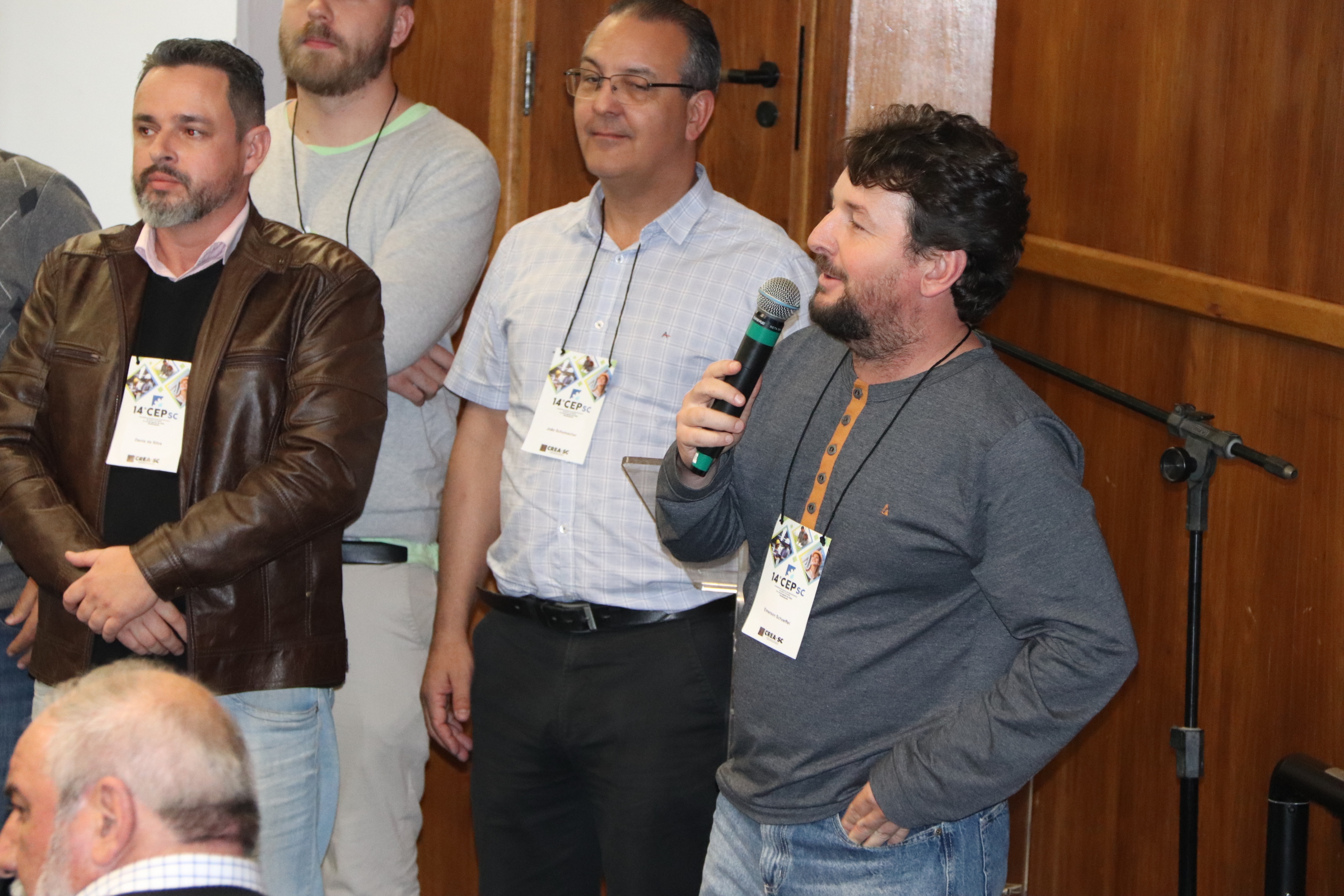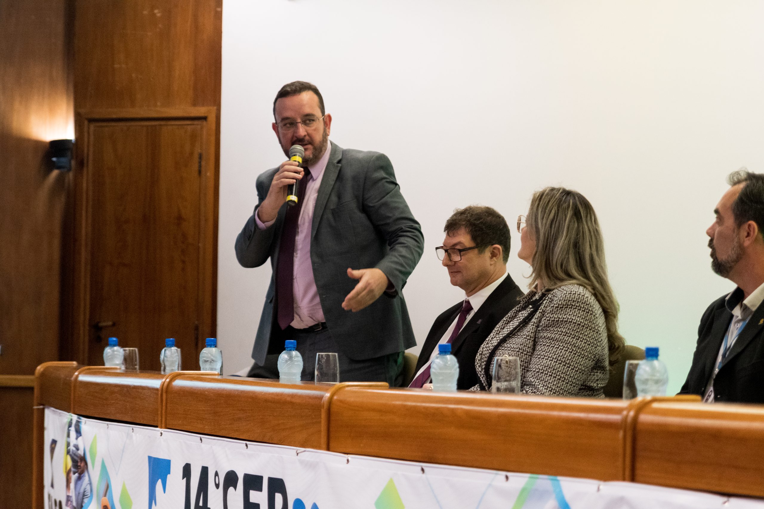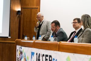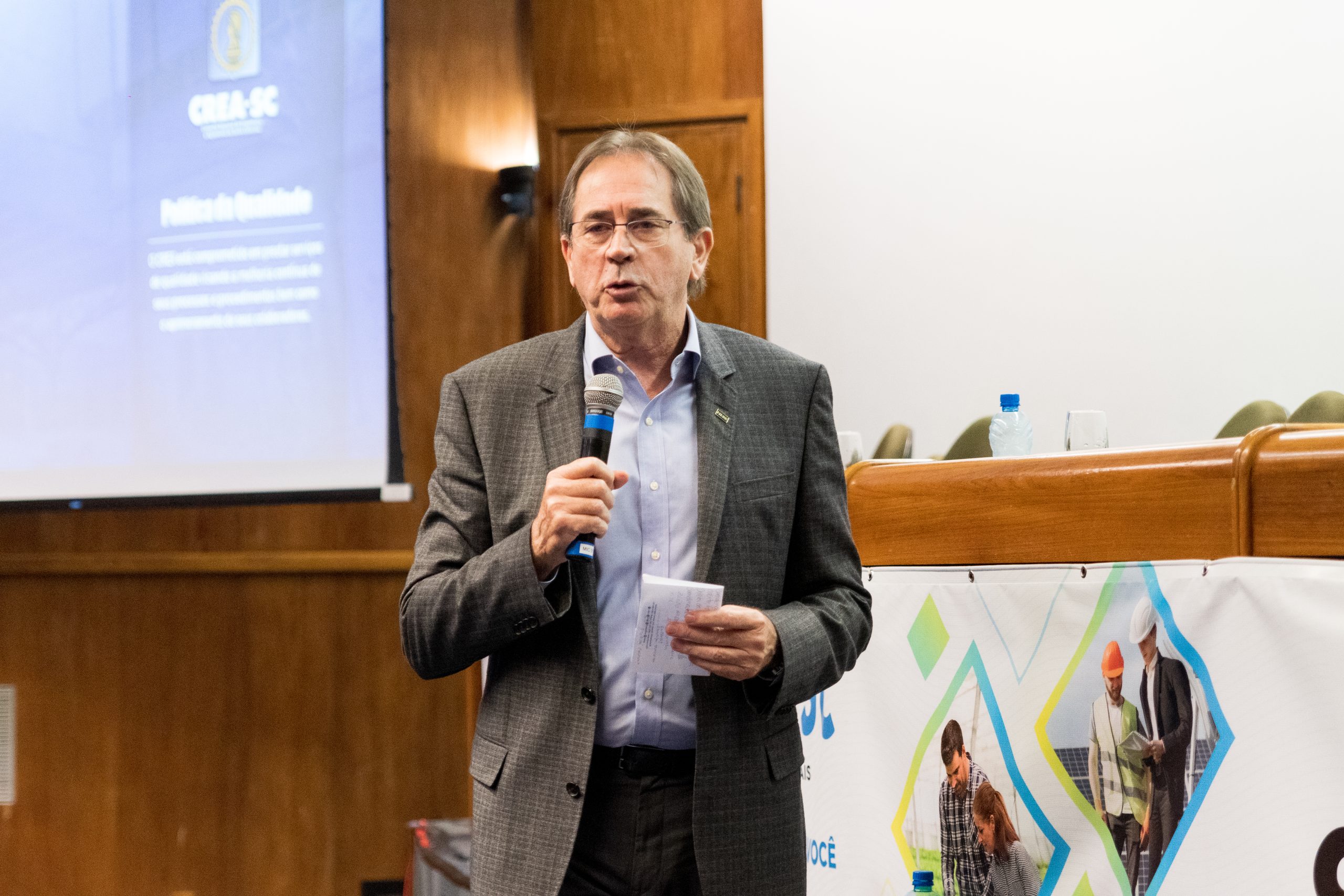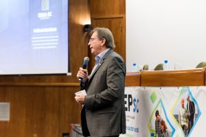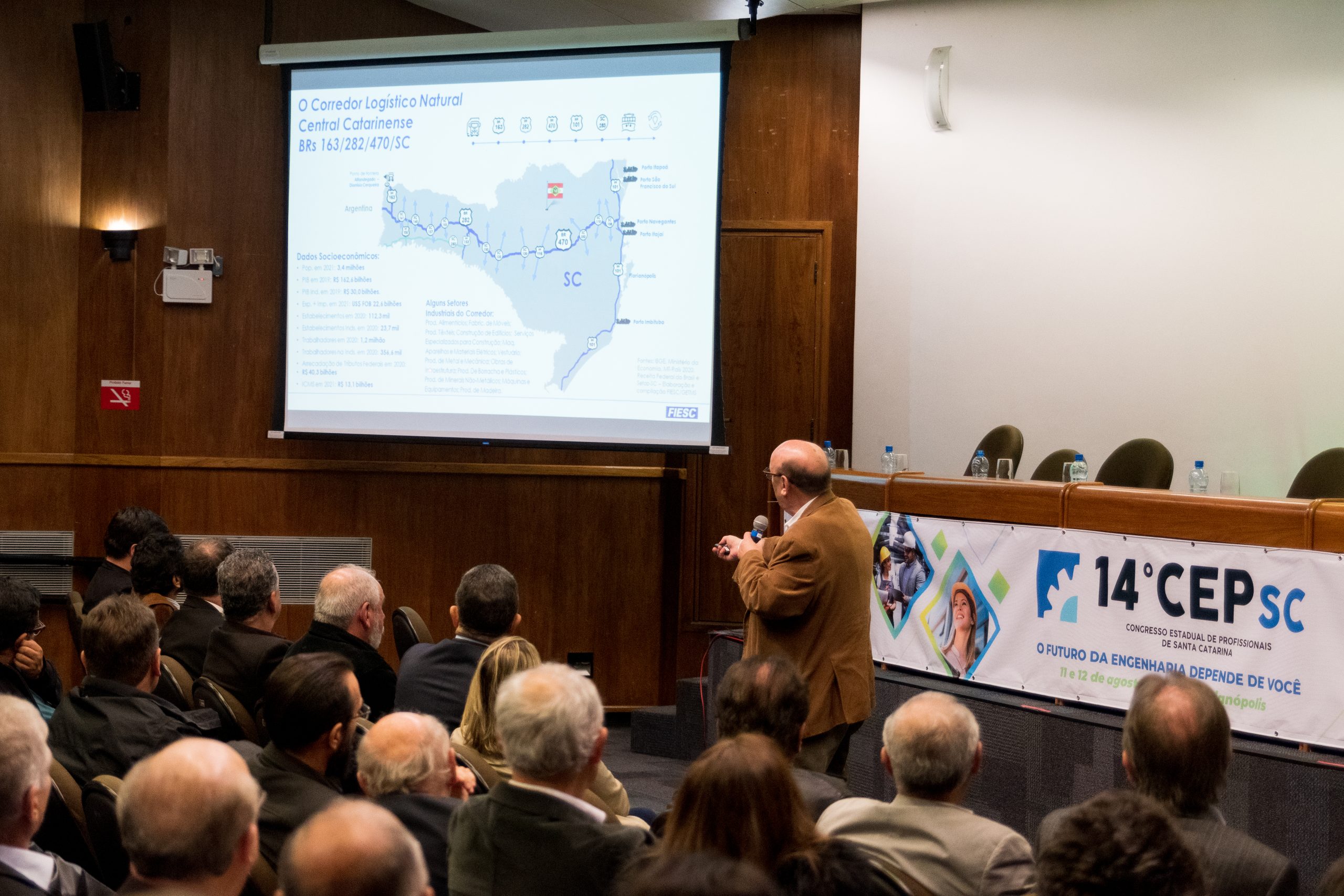 O 14 CEP iniciou às 19h de quinta-feira com a palestra “Infraestrutura no Estado de SC”, ministrada pelo presidente da FIESC, Eng. Civil Mário Cesar Aguiar. Formaram a mesa de abertura a presidente em exercício do CREA-SC, Engª Agrª Angela Cristina Paviani; o conselheiro federal Eng. Eletric. Evânio Ramos Nicoleit, representando o Confea; a coordenadora da Comissão Organizadora do 14º CEP, Eng. Sanitarista Amb. e de Seg. do Trab. Fernanda Vanhoni; o coordenador estadual adjunto do Colégio de Entidades Regionais de Santa Catarina- CDER, Eng. Agr. Valdir Silveira Ávila; o diretor de Distribuição da Celesc, Eng. Marco Aurélio Gianesini; o presidente da Cidasc, Eng. Agr. Junior Kunz; o diretor geral da Mútua-SC, Eng. Civil Carlos Koyti Nakazima e o presidente da Feagro, Eng. Agr. Athos de Almeida Lopes Filho, representando o presidente da Alesc, além do presidente da FIESC.